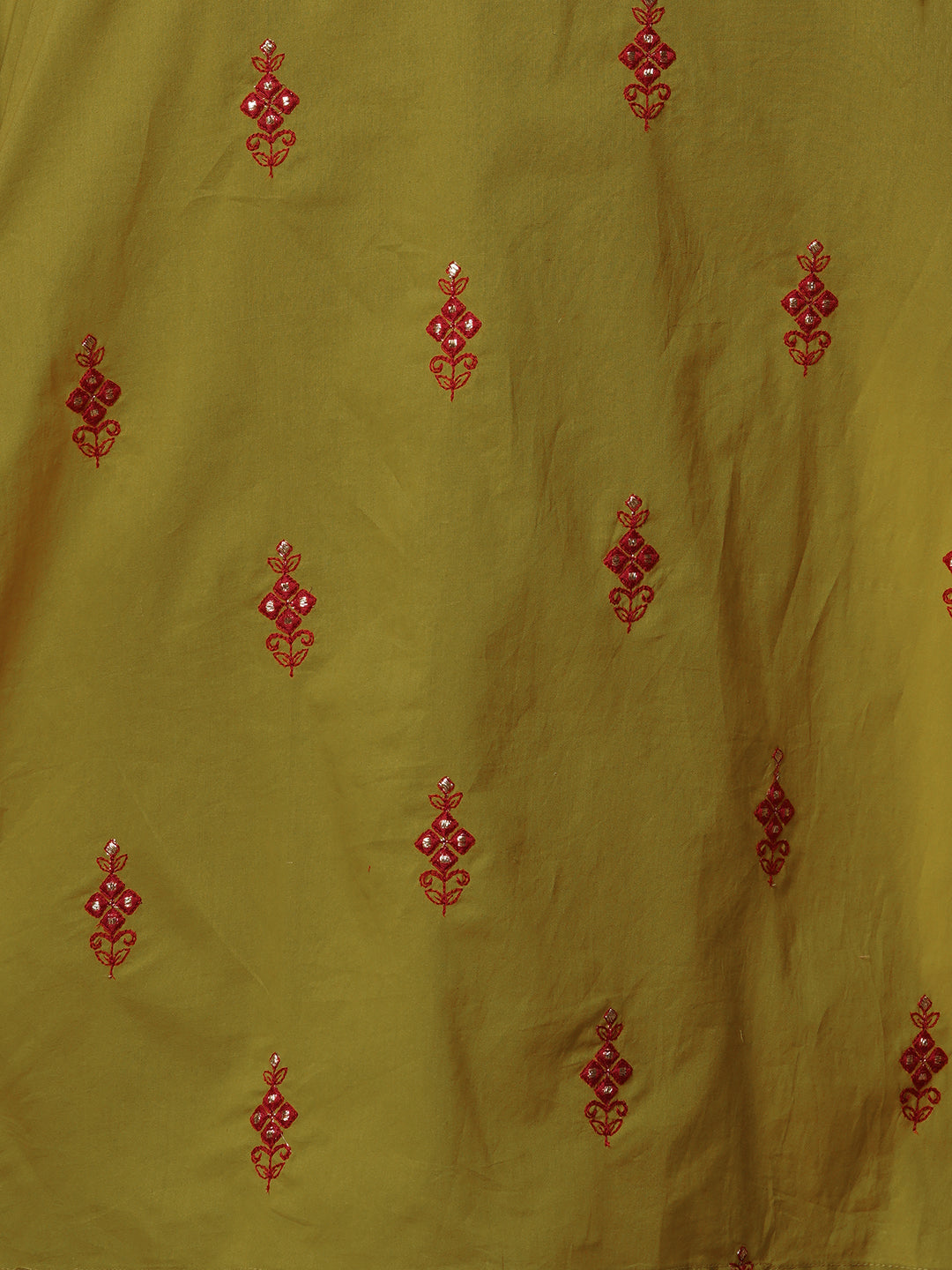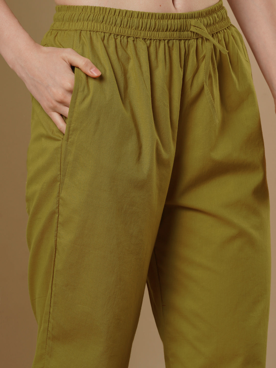 Celebrate the beauty of understated elegance with this Solid Ethnic Straight Cut Kurta Set in a refreshing green hue. Crafted from soft, breathable cotton, the kurta features a timeless straight silhouette, perfect for effortless everyday grace. The highlight is the beautifully detailed square yoke adorned with mirror embroidery, adding a touch of shimmer and tradition to the clean, solid base. Paired with a comfortable matching pant, the set is finished with a lightweight cotton mulmul dupatta that drapes like a dream, adding fluidity and finesse to the ensemble.