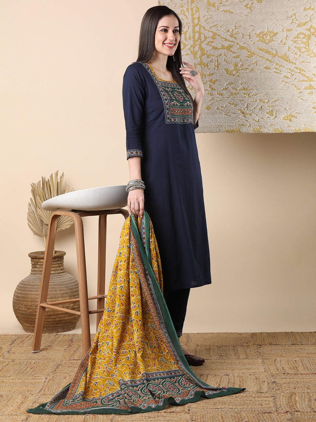 Solid Ethnic Printed & Embroidered Straight Kurta with Pant & Dupatta - Blue