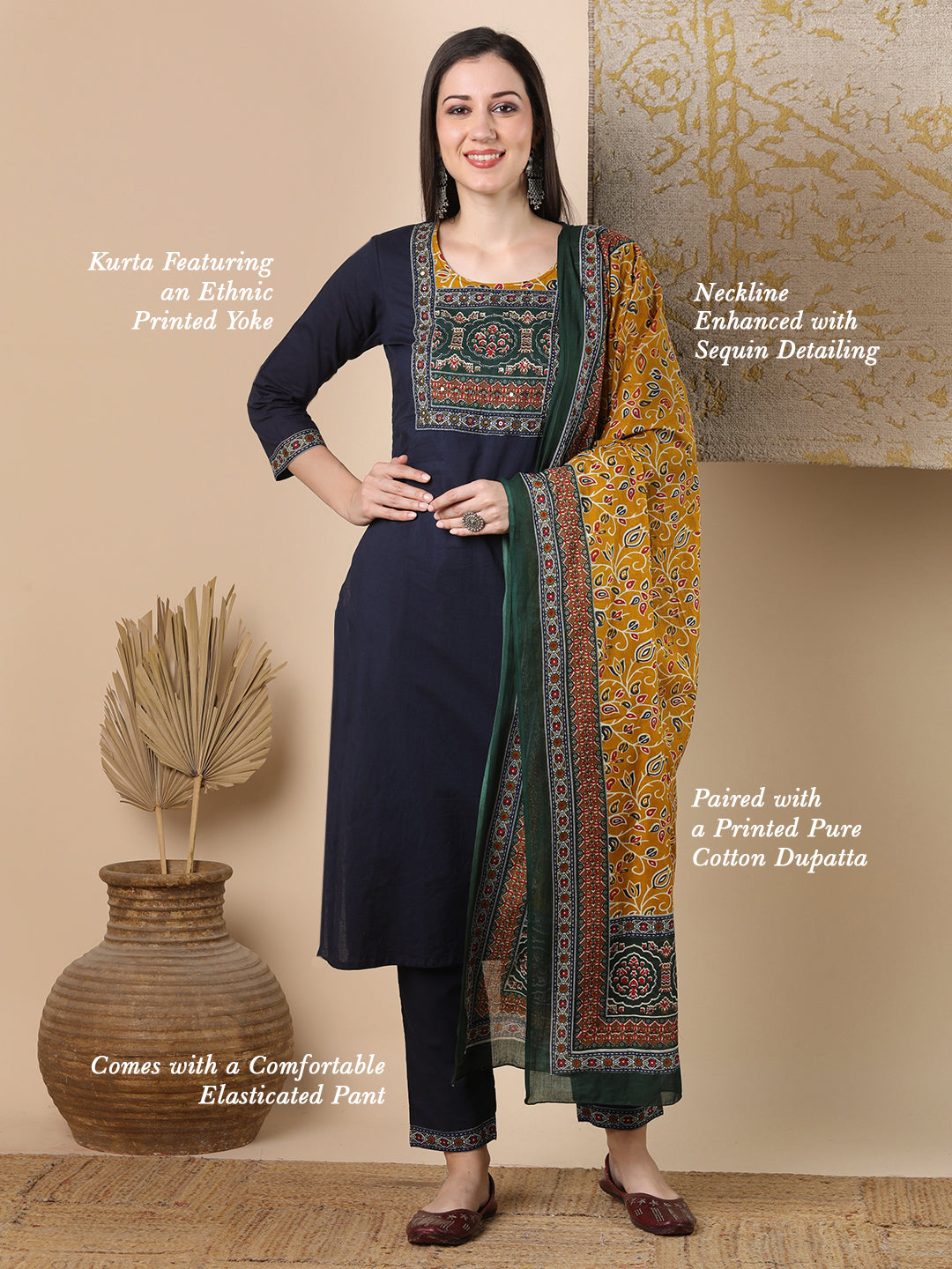 This straight fit kurta with ethnic printed yoke and round neckline with sequin detailing, paired with solid bottom and printed complementing dupatta, this style is perfect for everyday wear.