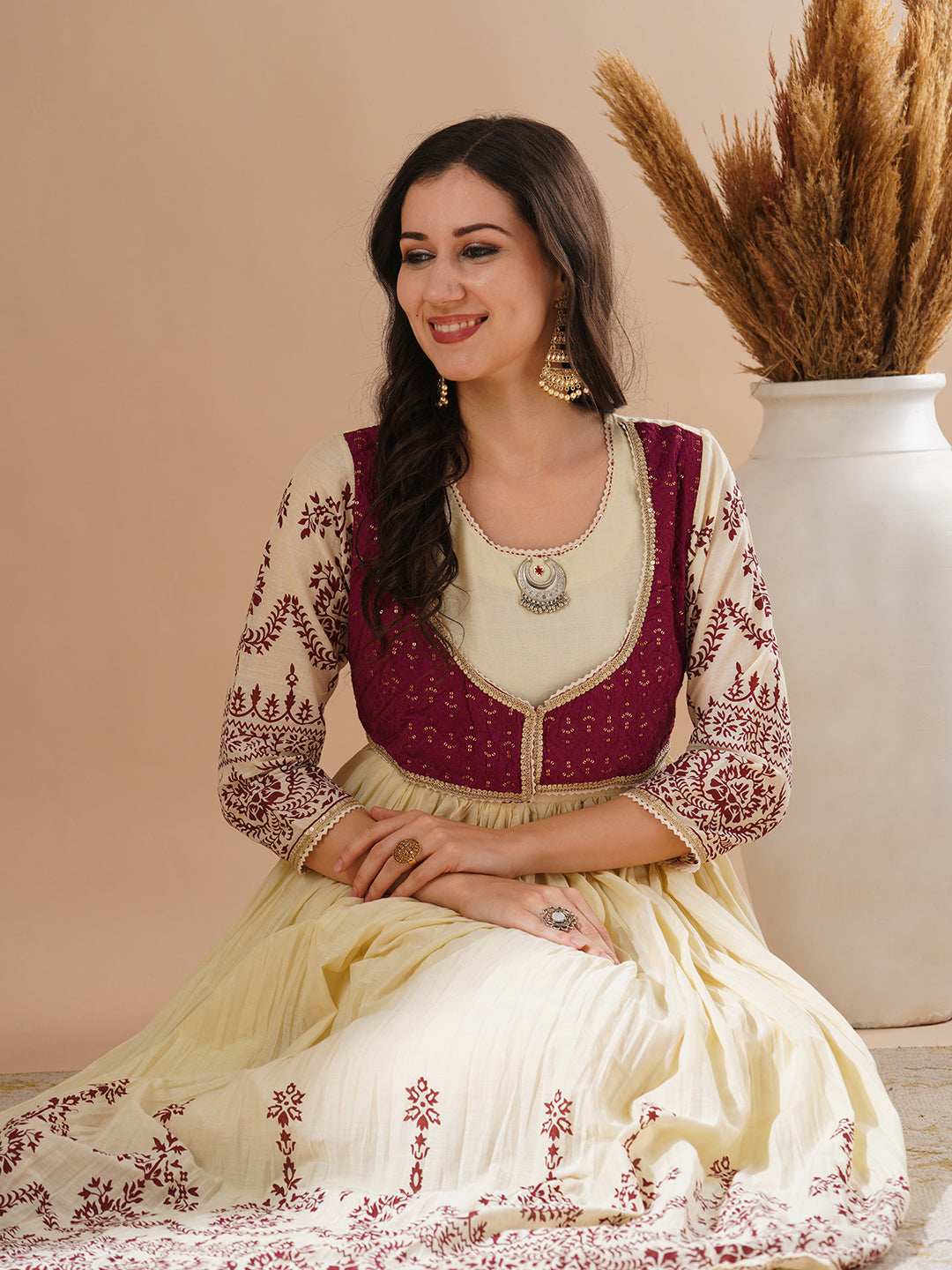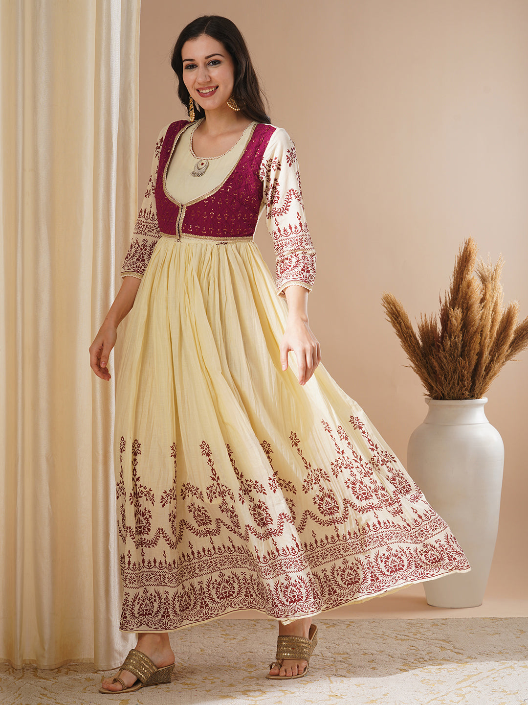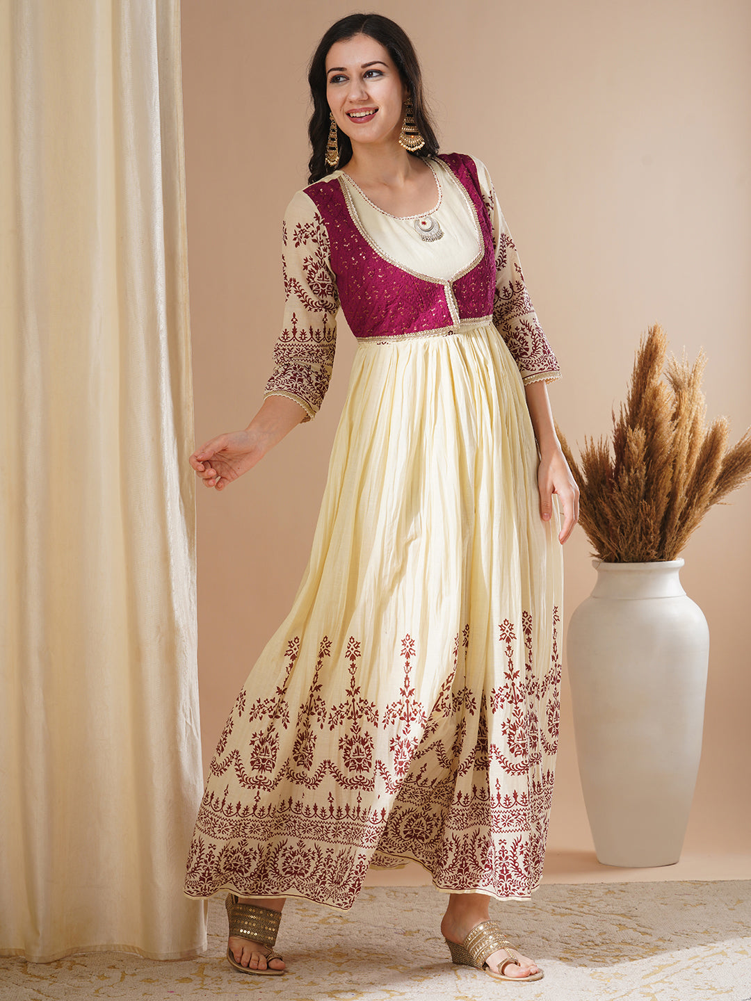 Solid Ethnic Printed Jacket Styled A-Line Pleated Maxi Dress - Off White