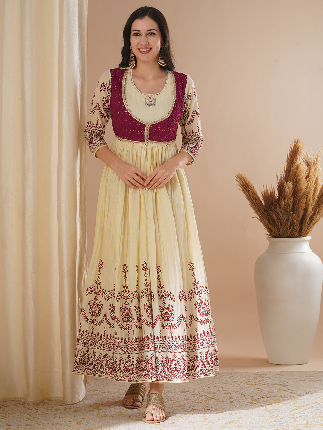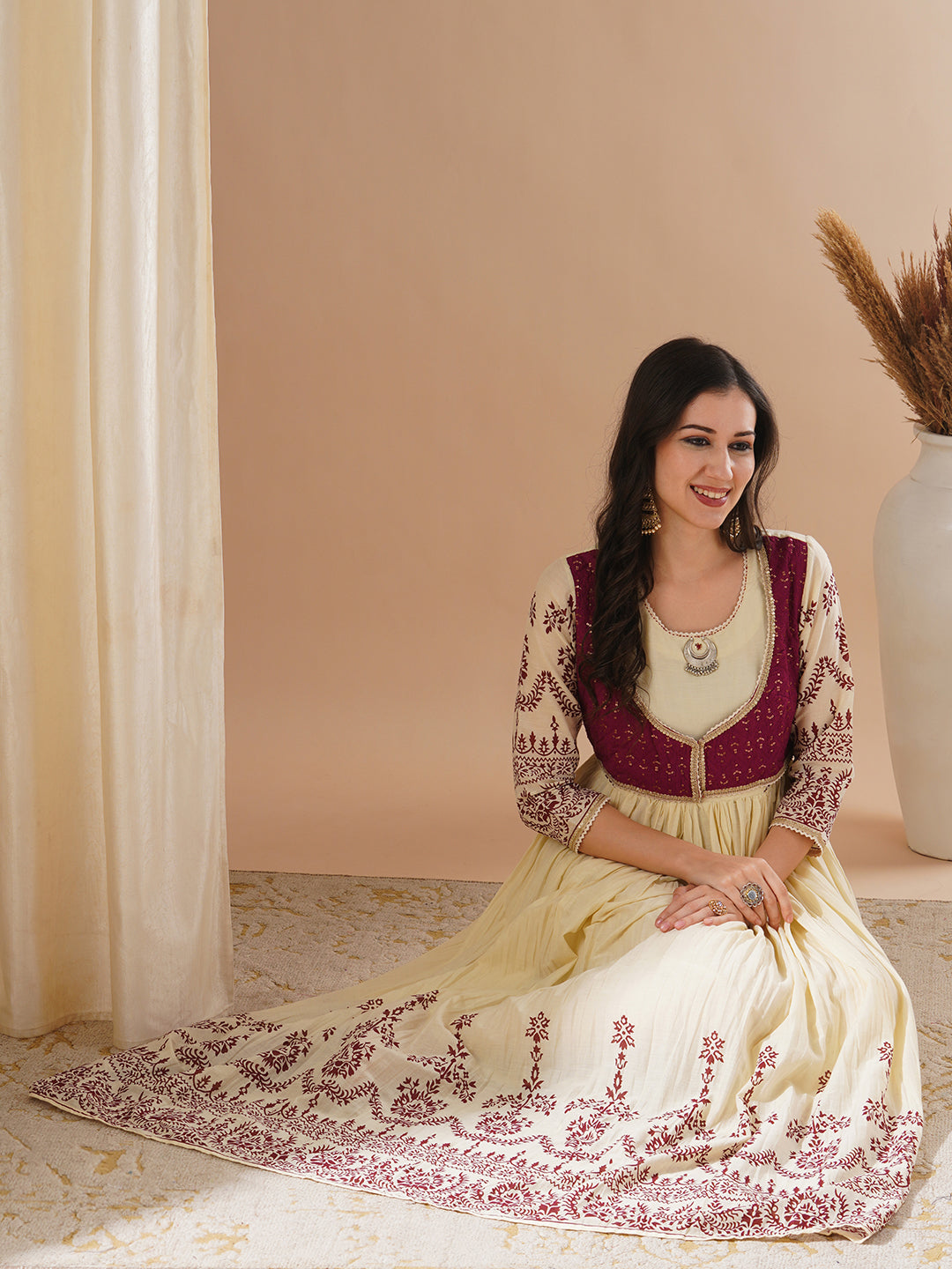 Floral Patchwork Embroidered A-Line Flared Kurta -...