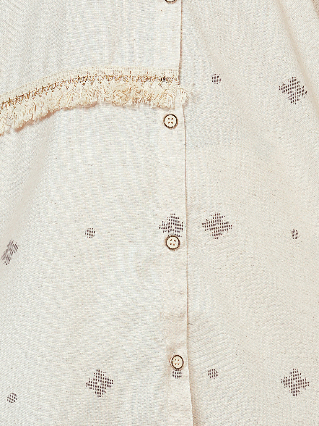 Elevate your ethnic wardrobe with this Off-White Solid Ethnic Woven Straight Fit Co-ord Set. Crafted from airy linen fabric, it features a classic shirt collar and is adorned with delicate crochet lace detailing. The subtle ethnic woven patterns add a touch of tradition to its modern silhouette—perfect for effortless daytime elegance.