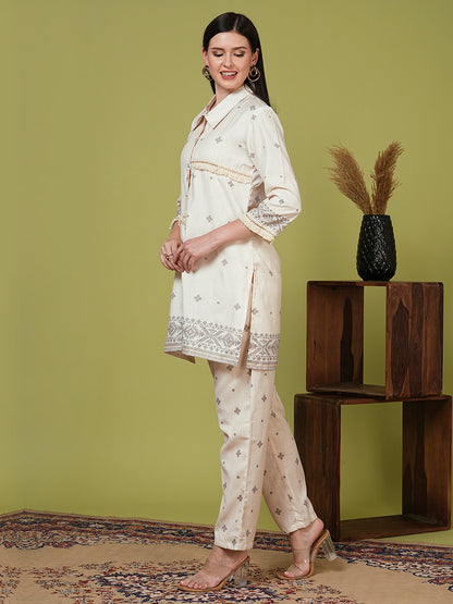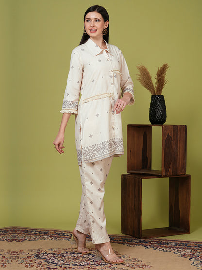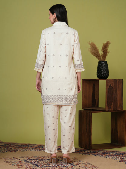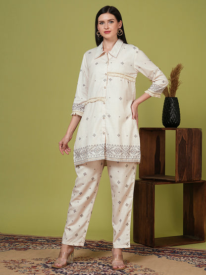 Solid Ethnic Woven Straight Fit Co-ord Set - Off White