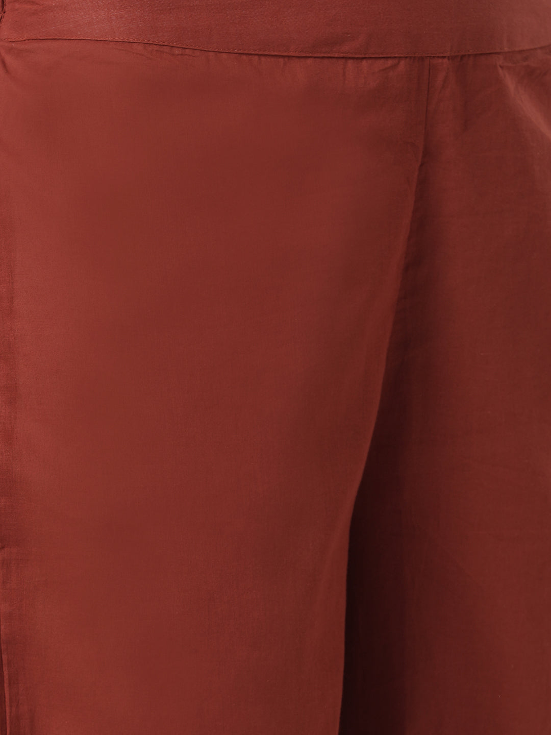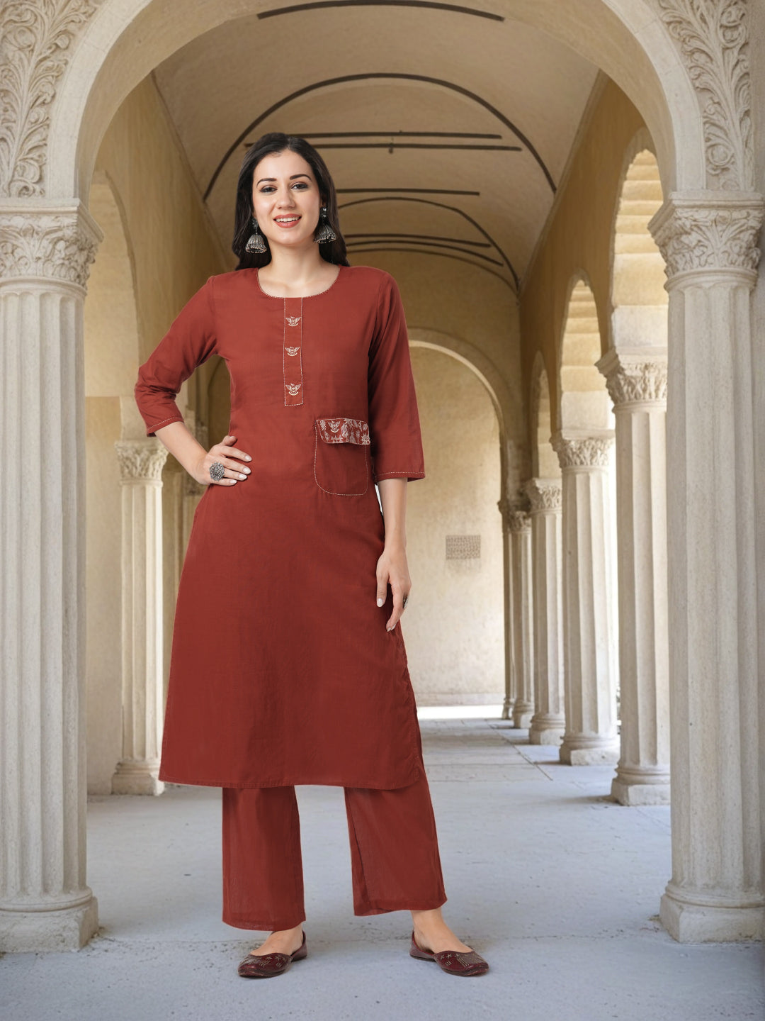 Solid Figurative Thread Embroidered Straight Fit Co-ord Set - Rust