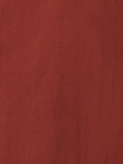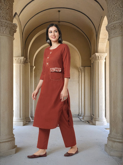 -Minimalist with a twist, this straight-fit Rust cotton co-ord set features a classic round neckline and is elevated by lady figurative thread embroidery on the front placket and patch pocket. A subtle statement piece that blends everyday ease with artistic detail.