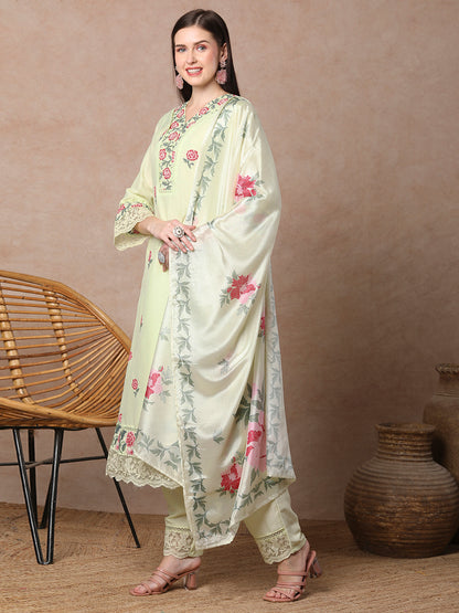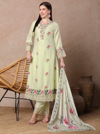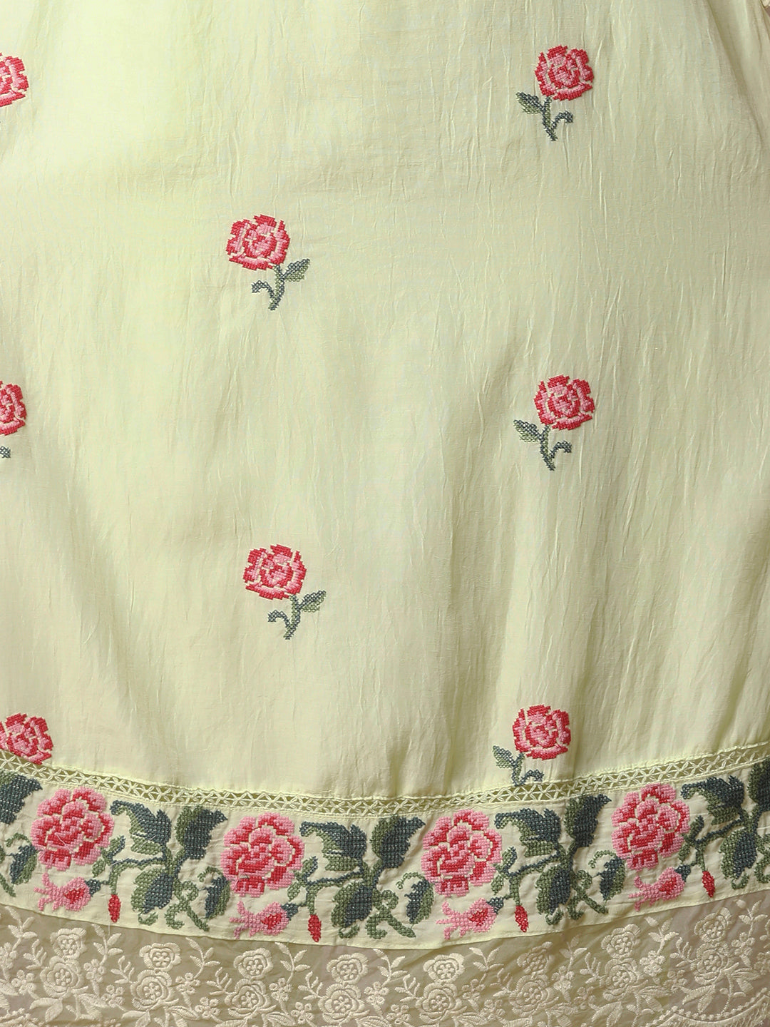 Solid Floral Cross Stitch Embroidered A-Line Flared Kurta with Pant & Dupatta - Mint Yellow