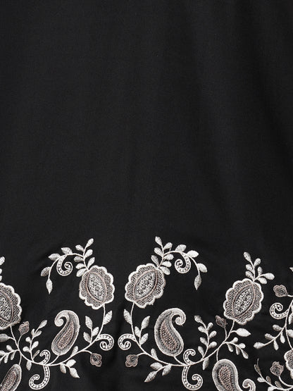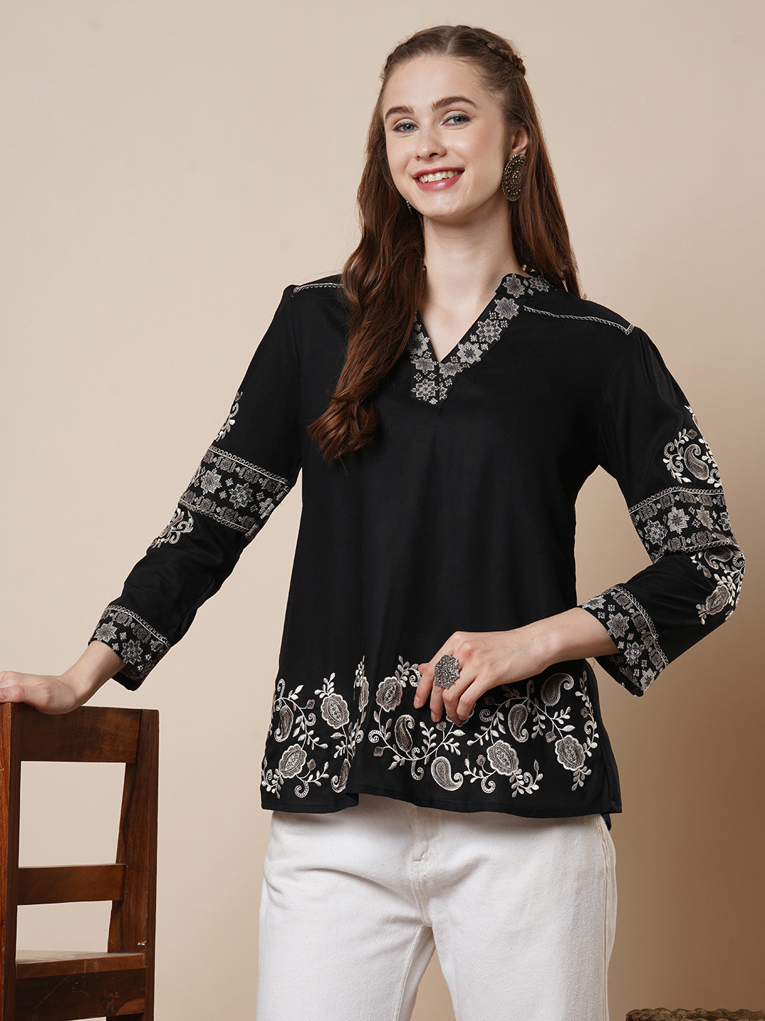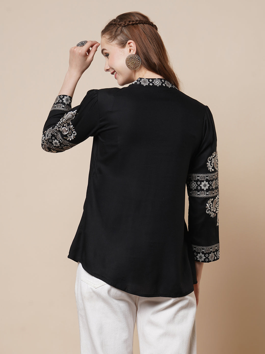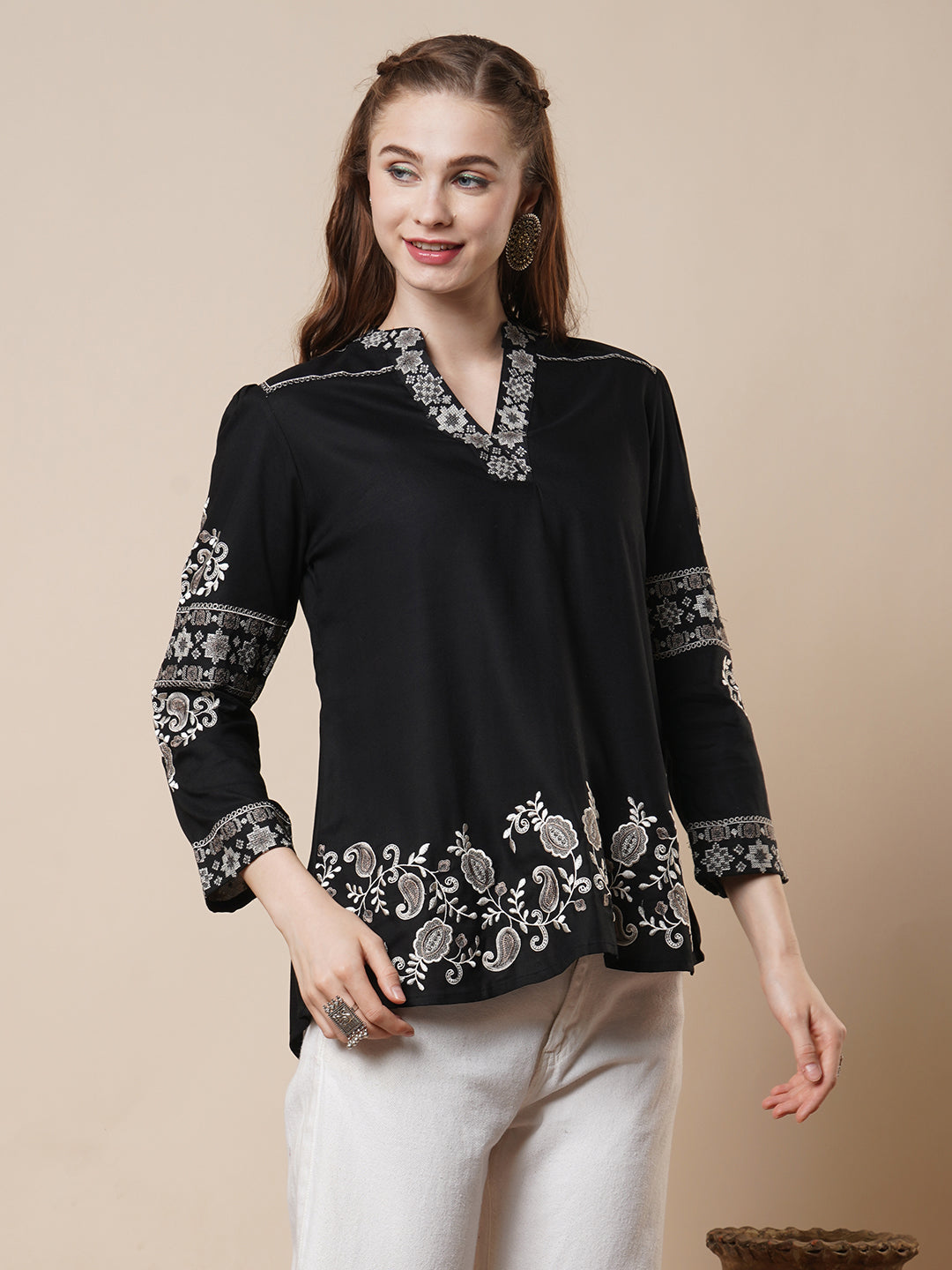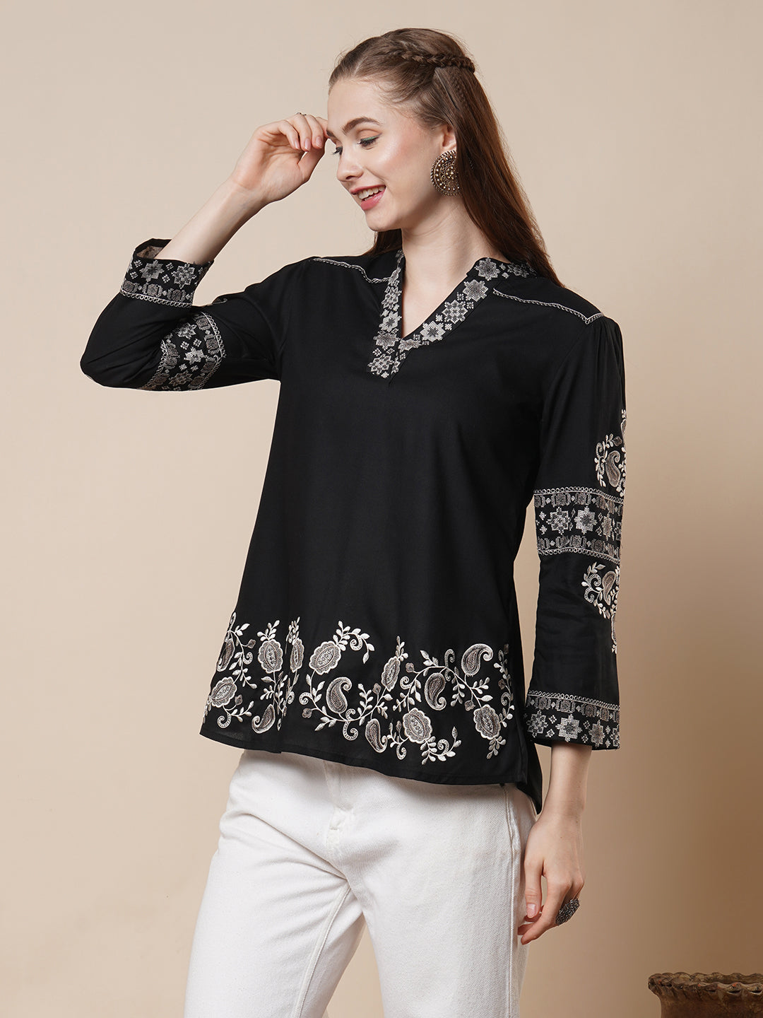 Elevate your everyday ethnic style with this Black A-Line Short Kurti. Crafted from soft and breathable viscose rayon, it features intricate paisley and floral cross-stitch embroidery that adds a handcrafted touch of elegance. The smart mandarin collar and long sleeves lend a refined, contemporary edge. Its flattering A-line silhouette makes it perfect for both casual outings and festive gatherings. A versatile piece that blends traditional charm with modern flair.