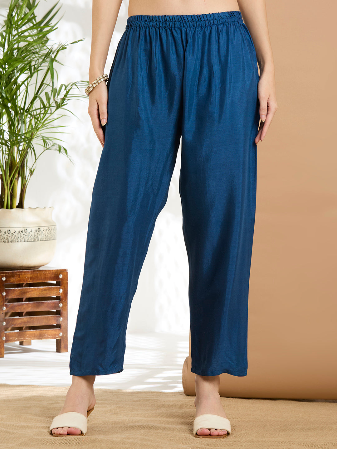 Elevate your ethnic elegance with this Solid Floral Embroidered A-Line Kurta Set in a rich navy blue hue. Crafted from luxurious shantoon fabric, the kurta features a graceful V-neckline and intricate floral embroidery that adds a touch of sophistication. Paired with matching pants and a complementing dupatta, this ensemble blends classic charm with modern finesse — perfect for festive celebrations or evening soirées.