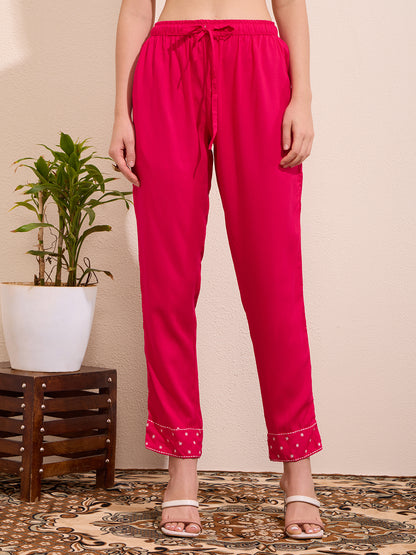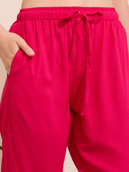 Elevate your ethnic wardrobe with this elegant pink A-line kurta set, crafted from soft viscose rayon. Featuring a flattering V-neckline and delicate floral threadwork embroidery, it pairs effortlessly with matching pants and a flowy chiffon dupatta. A perfect blend of comfort and charm for festive days or graceful evenings.