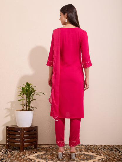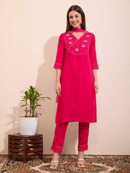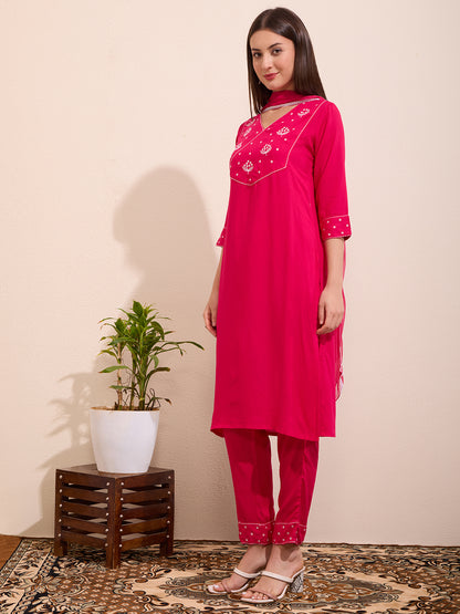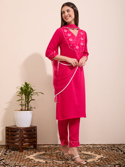 Solid Floral Embroidered A-Line Kurta with Pant & Dupatta - Pink