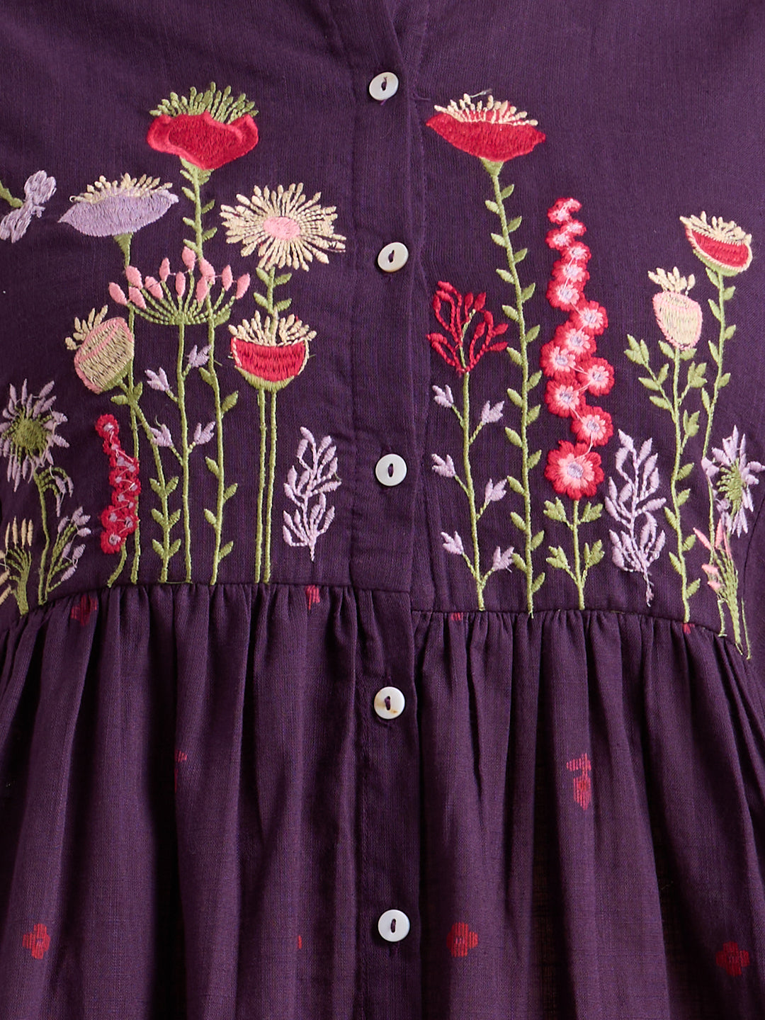 Elevate your ethnic charm with this elegant Purple Solid Floral Embroidered A-Line Pleated Kurta set. Crafted from soft cotton fabric, the kurta features a classic mandarin collar neckline adorned with delicate threadwork embroidery that adds a subtle shimmer. The flattering A-line silhouette with graceful flares pairs perfectly with matching Palazzo and a lightweight dupatta, creating a refined and festive-ready ensemble. Ideal for celebrations or casual gatherings, this set blends comfort with understated glam.