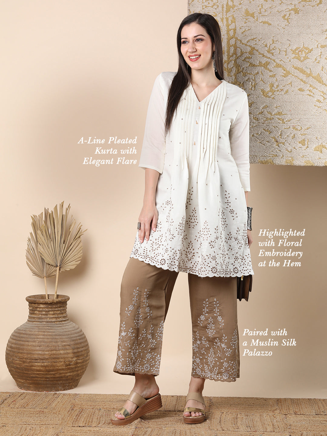 Solid Floral Embroidered A-Line Pleated Kurta with Palazzo - White