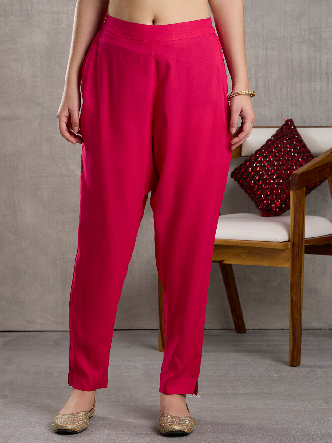 Solid Floral Embroidered Anarkali Flared Kurta with Pant & Dupatta - Rani