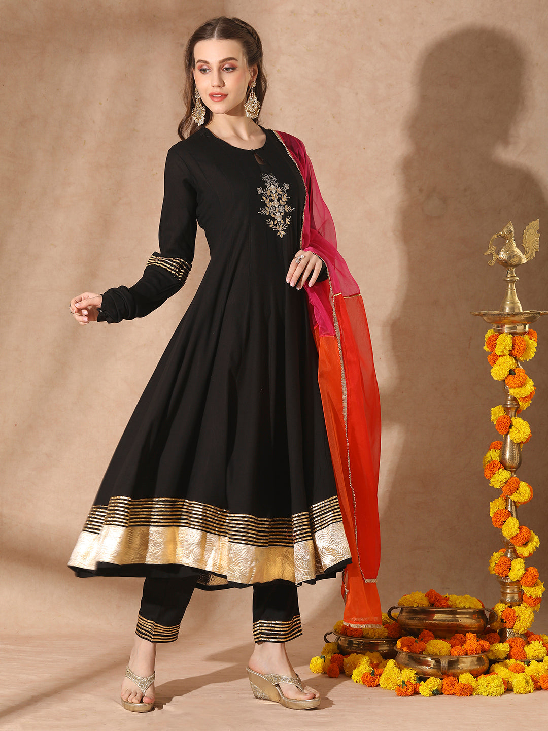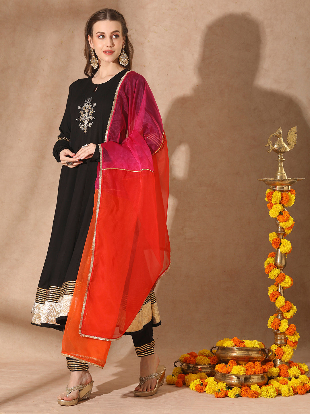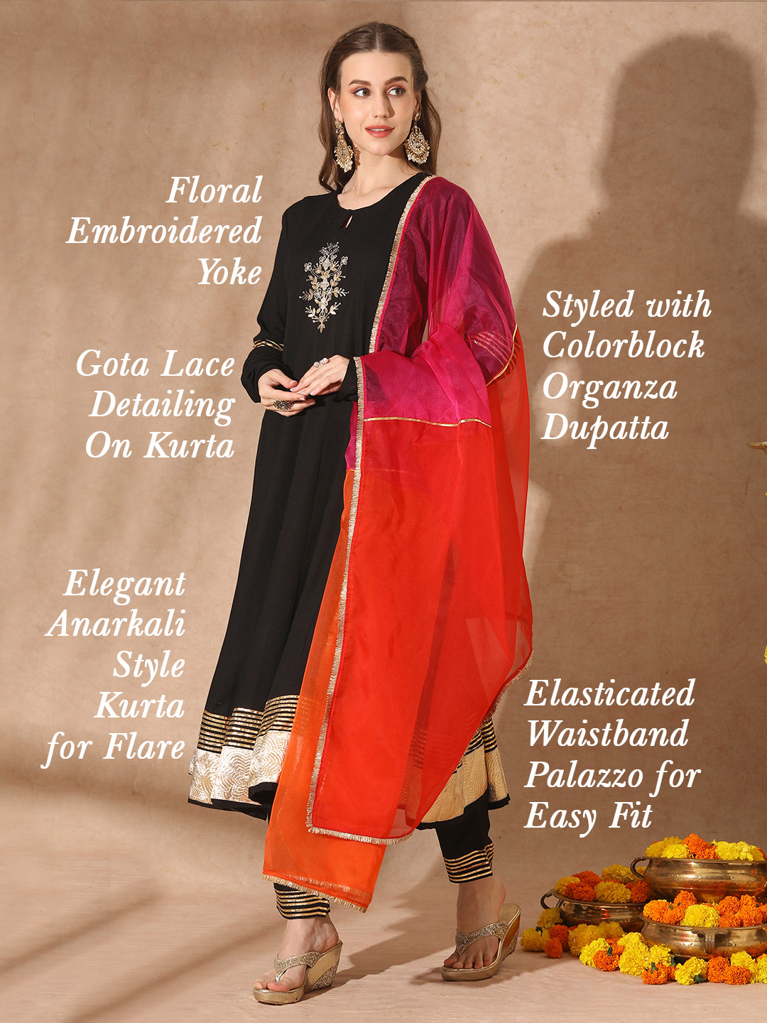 Solid Floral Embroidered Anarkali Kurta with Pant & Colorblocked Dupatta - Black
