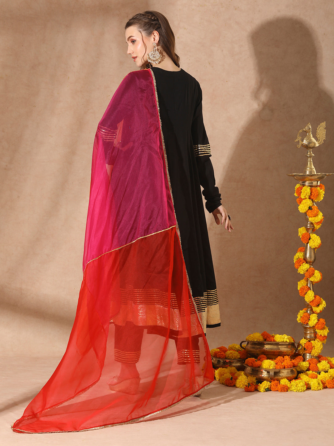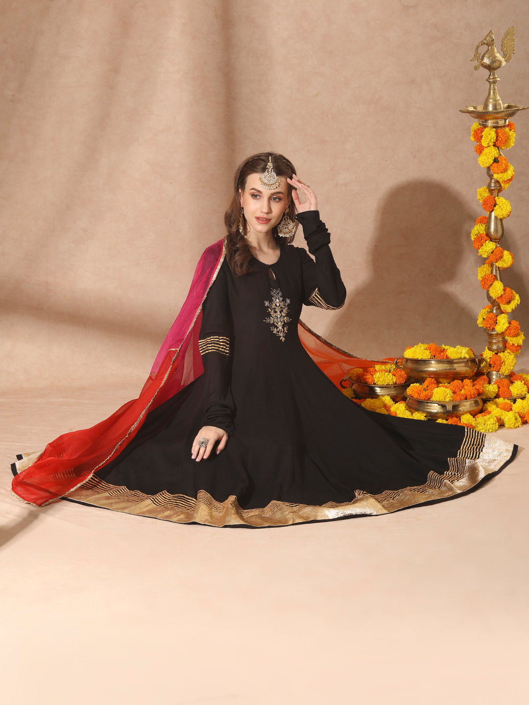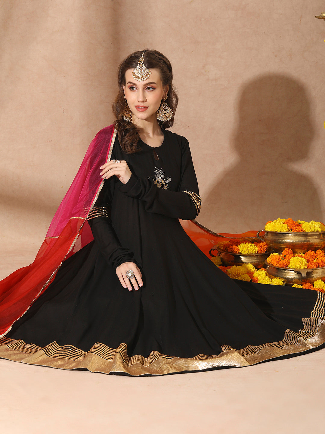 Solid Floral Embroidered Anarkali Kurta with Pant & Colorblocked Dupatta - Black