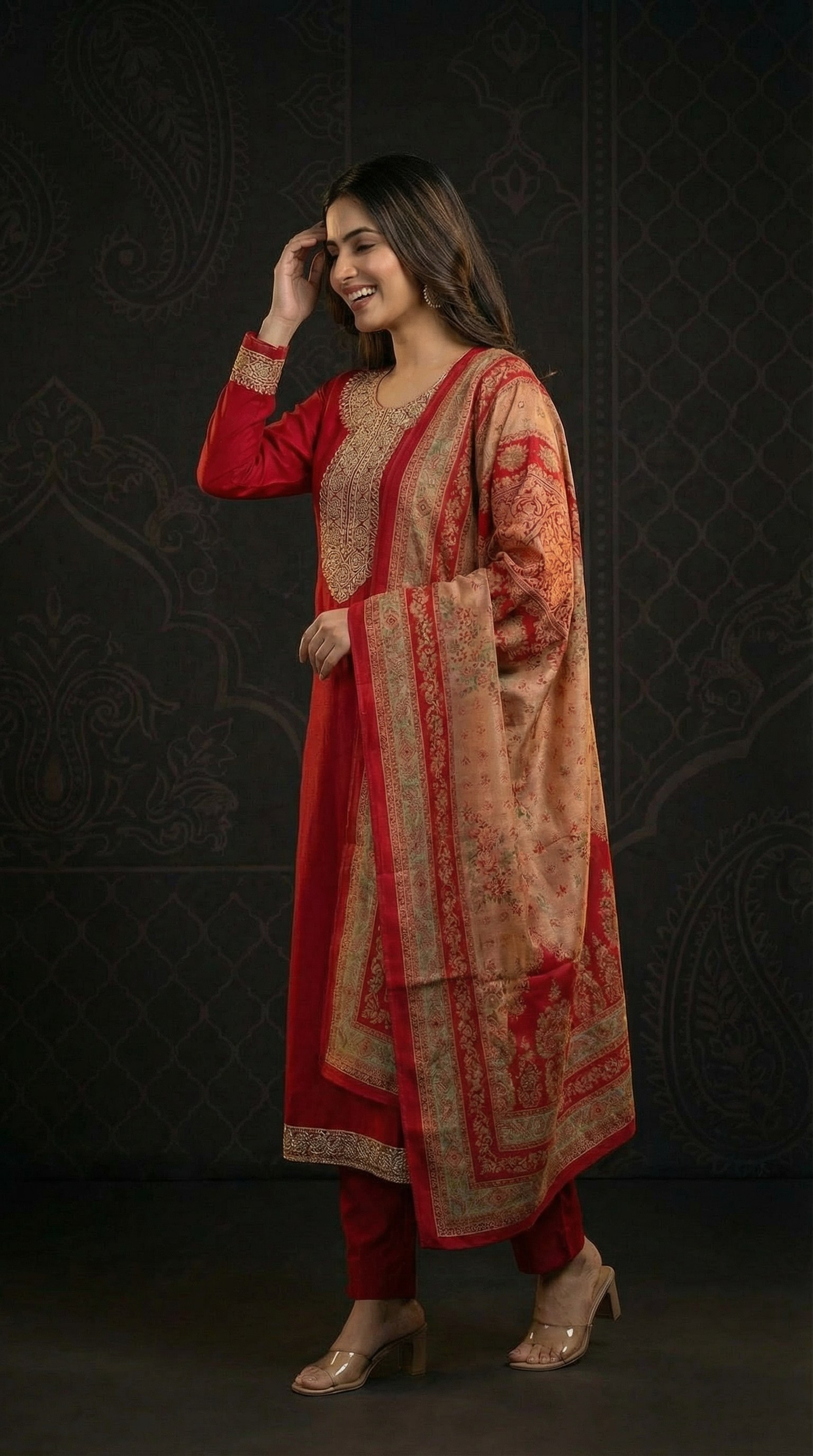 -Step into refined ethnic elegance with this Solid MaroonFloral Embroidered Anarkali Kurta Set with Pant & Dupatta. Crafted from luxurious shantoon fabric, it offers a soft sheen and graceful drape. The classic round neckline is beautifully enhanced with intricate handwork floral embroidery, adding artisanal charm. Paired with a coordinated pant and matching printed dupatta, this ensemble is perfect for festive celebrations, weddings, or special occasions, blending richness with timeless sophistication.