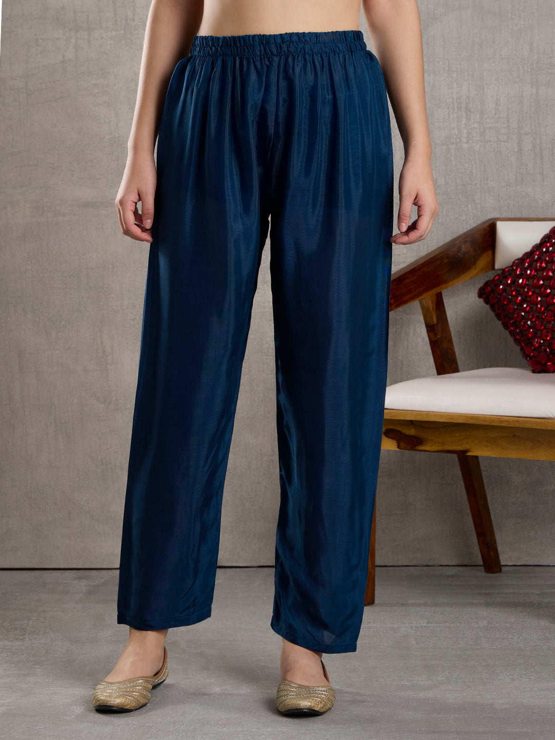 Solid Floral Embroidered Jacquard Kurta with Pant & Dupatta - Navy Blue
