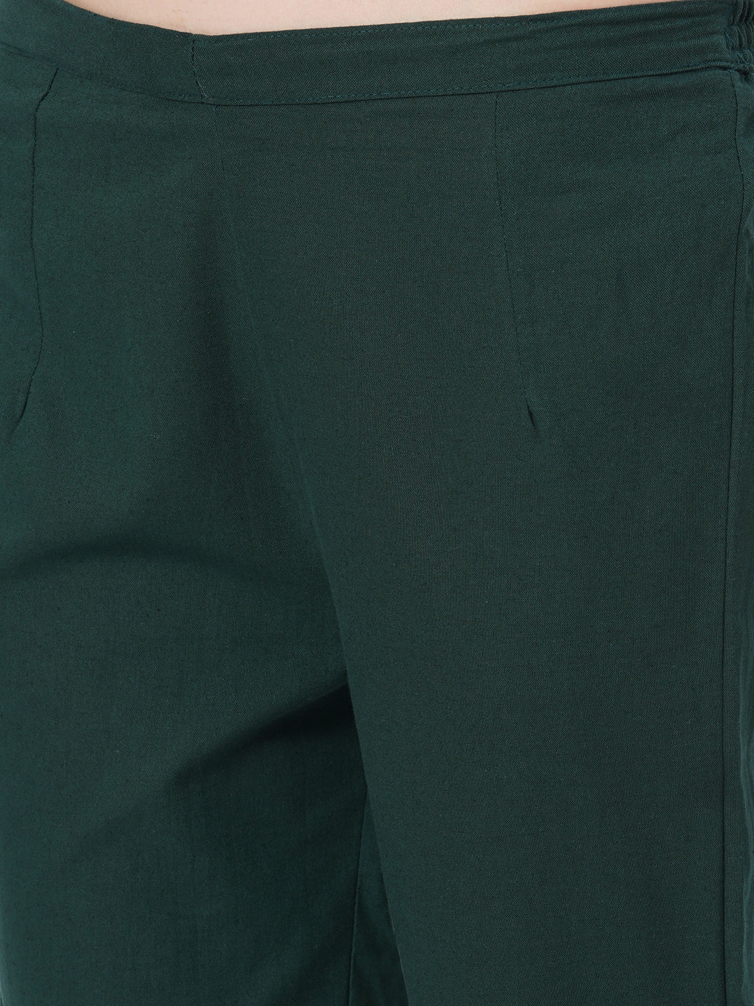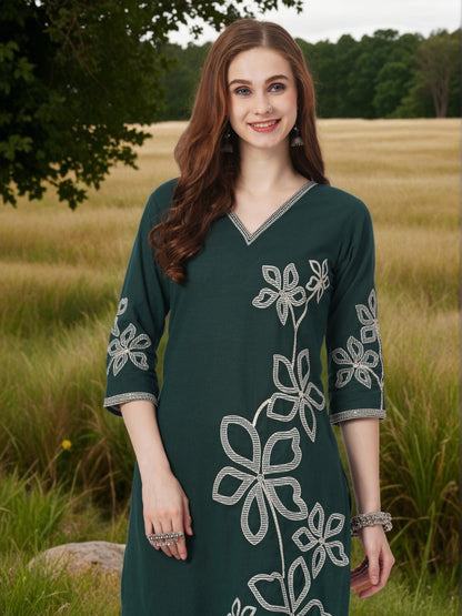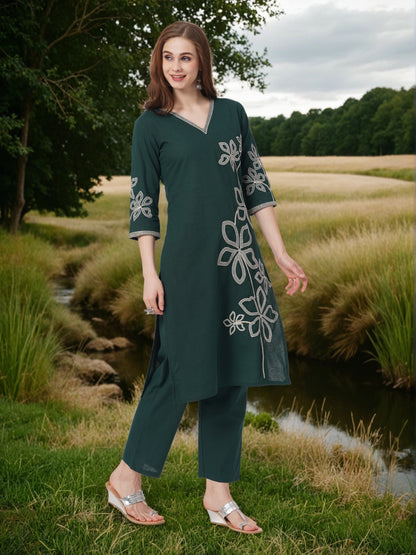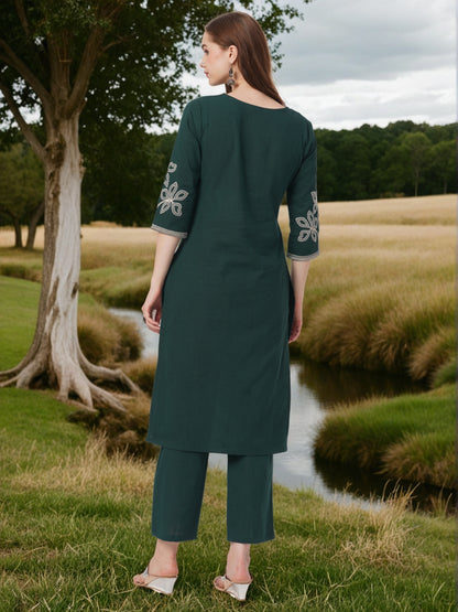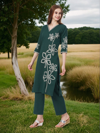Step into timeless elegance with this Solid Floral Embroidered Straight Fit Co-ord Set in classic Green. Crafted from breathable cotton flax fabric, it offers a natural texture and airy comfort. The kurta features a flattering V-neckline and is adorned with delicate floral threadwork detailing for a subtle yet sophisticated look. Paired with a matching palazzo, the ensemble delivers effortless grace and everyday wearability. Its minimalist charm makes it ideal for casual outings or semi-formal occasions. A versatile choice that blends simplicity with artisanal finesse.