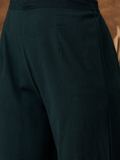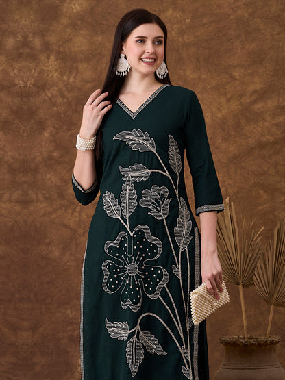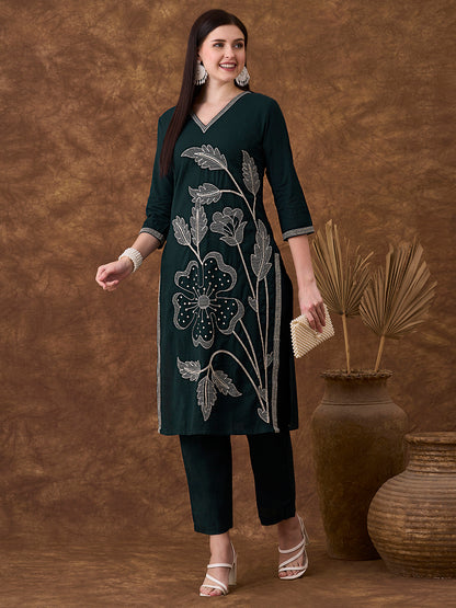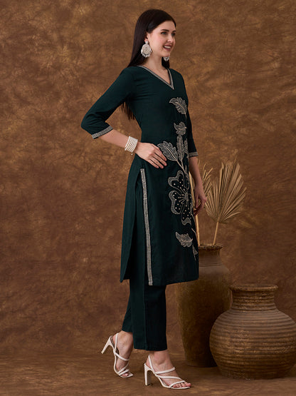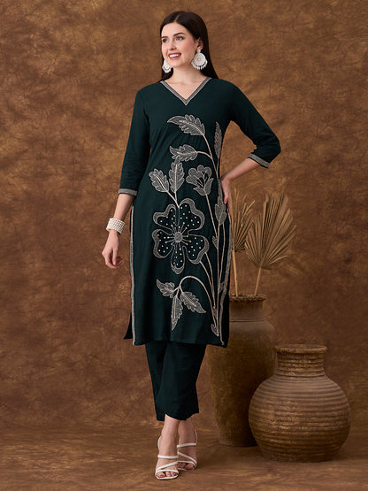 Step into timeless elegance with this Solid Floral Embroidered Straight Fit Co-ord Set in classic Green. Crafted from breathable cotton flax fabric, it offers a natural texture and airy comfort. The kurta features a flattering V-neckline and is adorned with delicate floral threadwork detailing for a subtle yet sophisticated look. Paired with a matching palazzo, the ensemble delivers effortless grace and everyday wearability. Its minimalist charm makes it ideal for casual outings or semi-formal occasions. A versatile choice that blends simplicity with artisanal finesse.