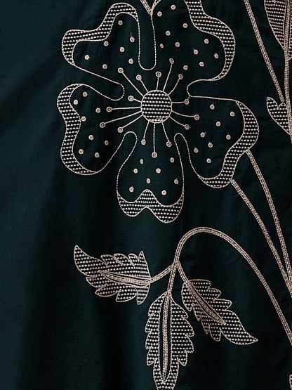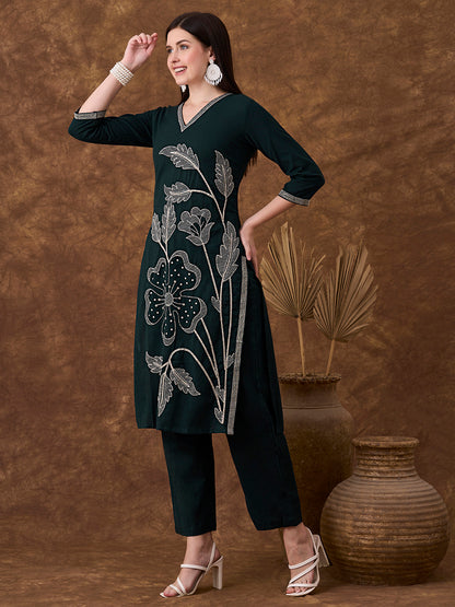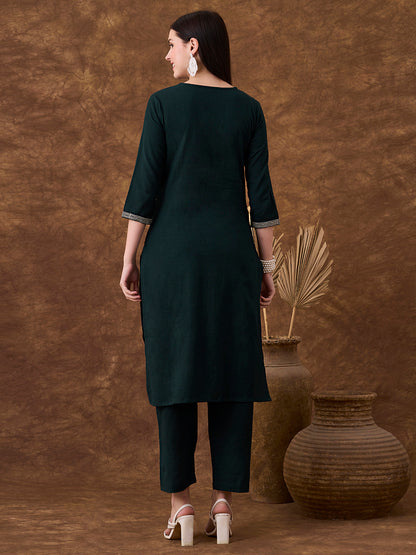 Solid Floral Embroidered Straight Fit Co-ord Set -Green