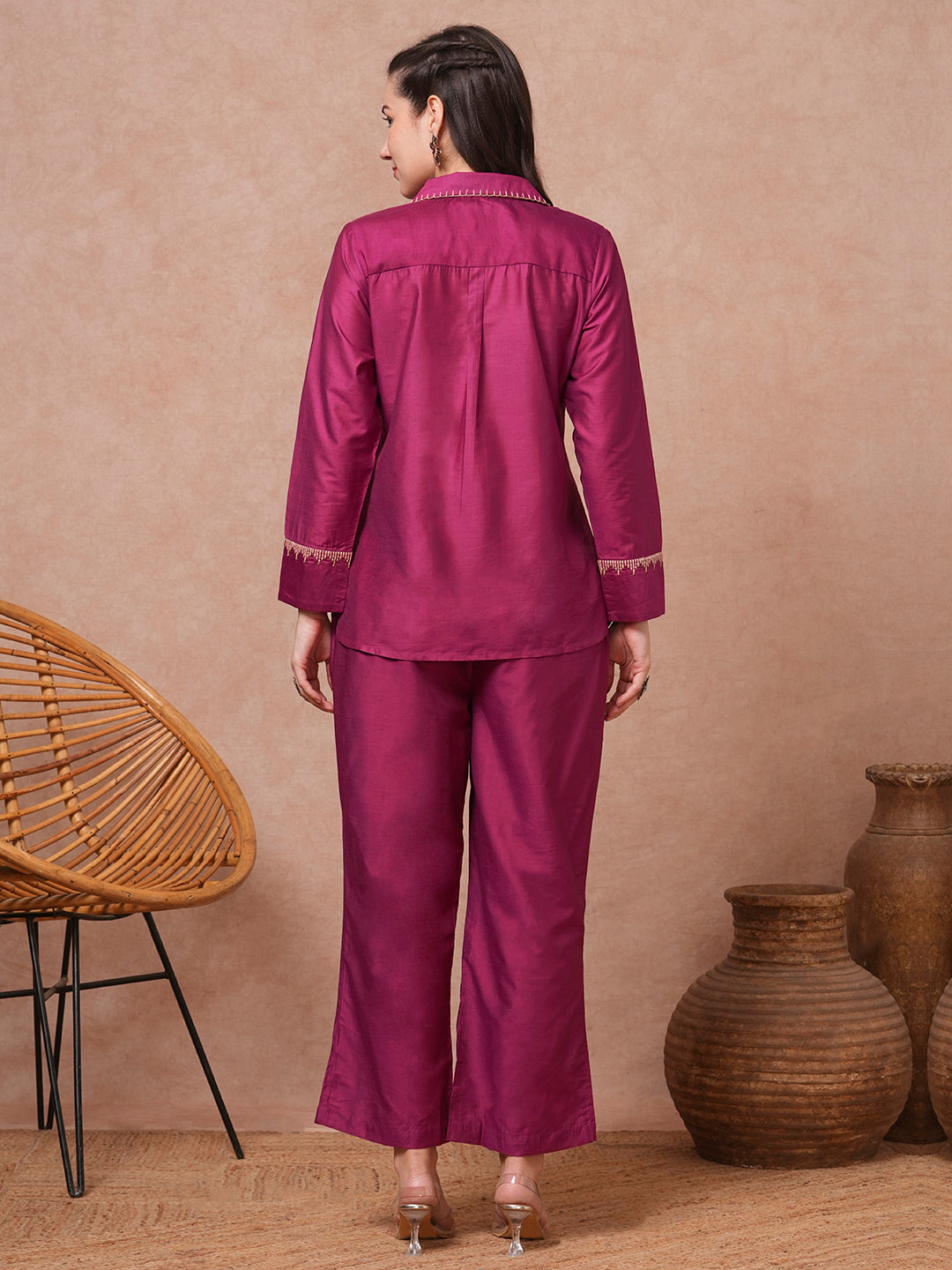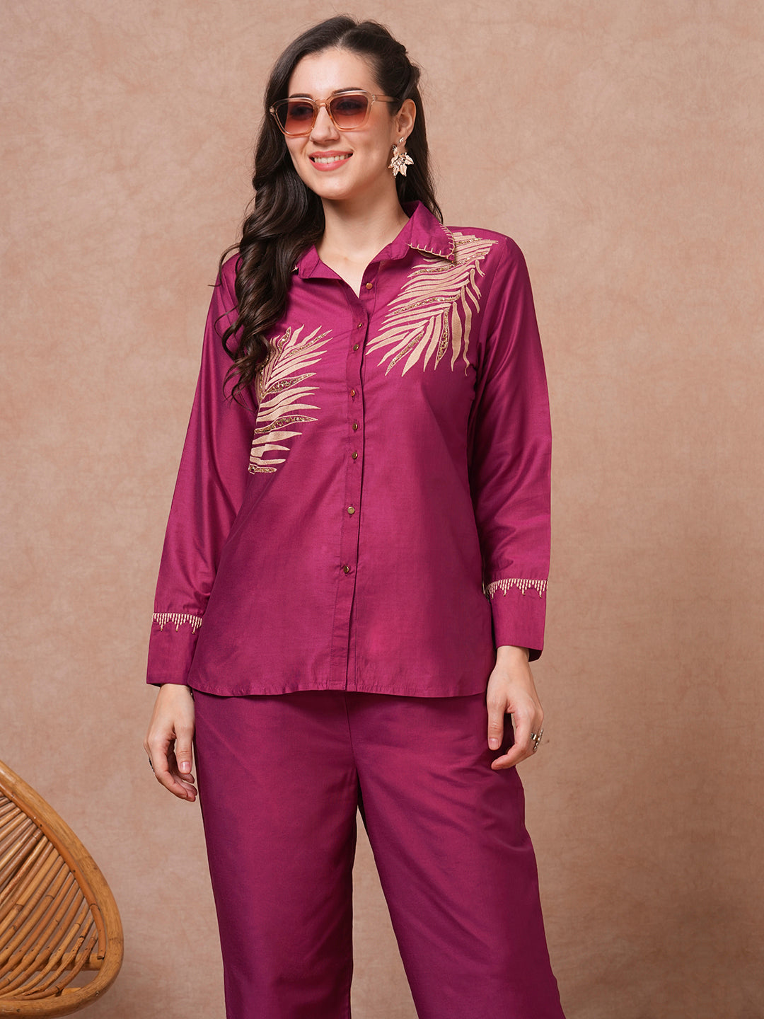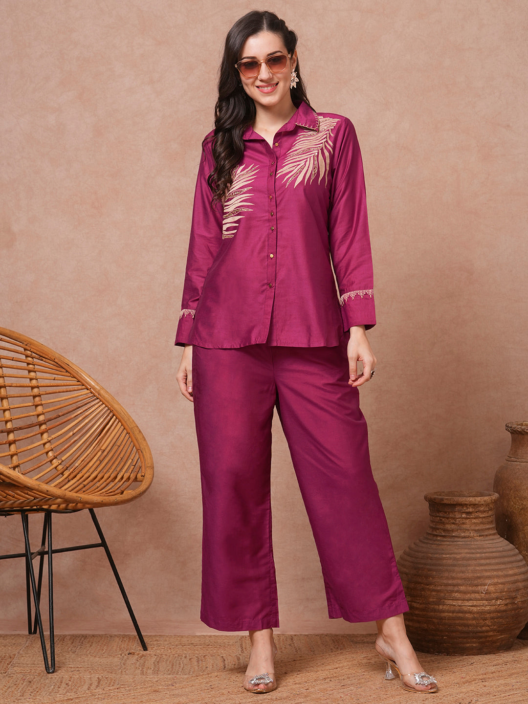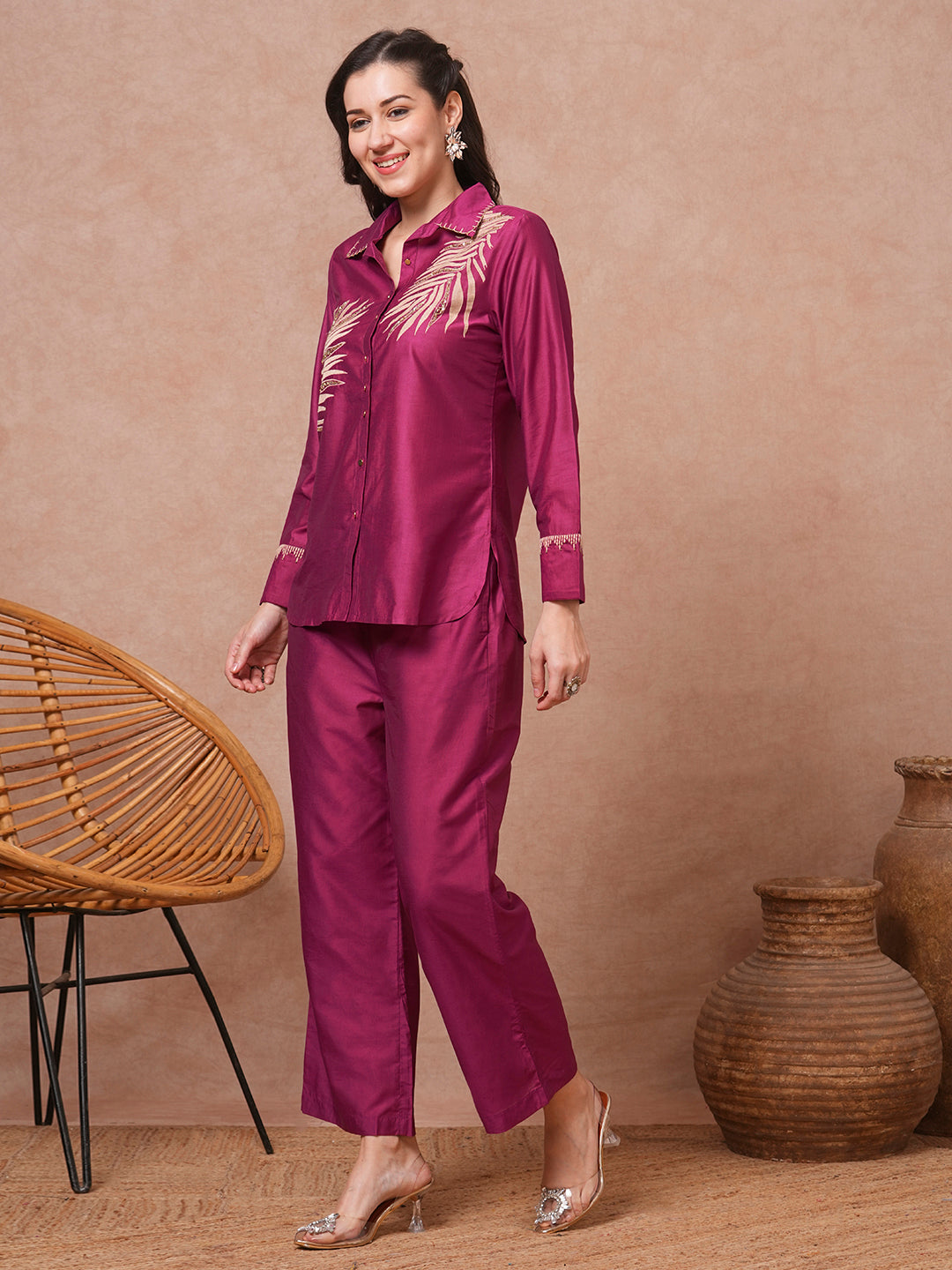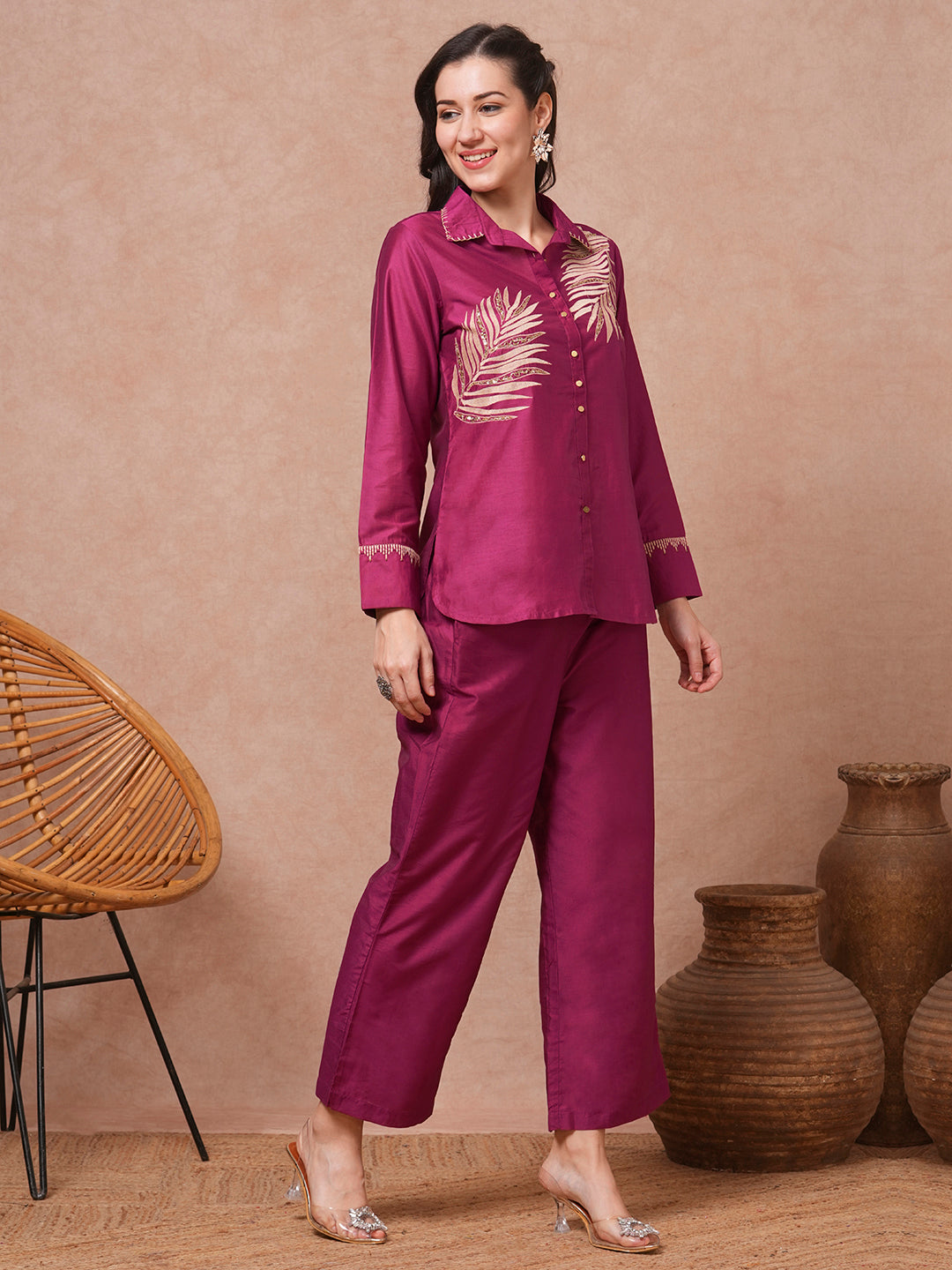 Solid Floral Embroidered Straight Fit Co-ord Set - Magenta