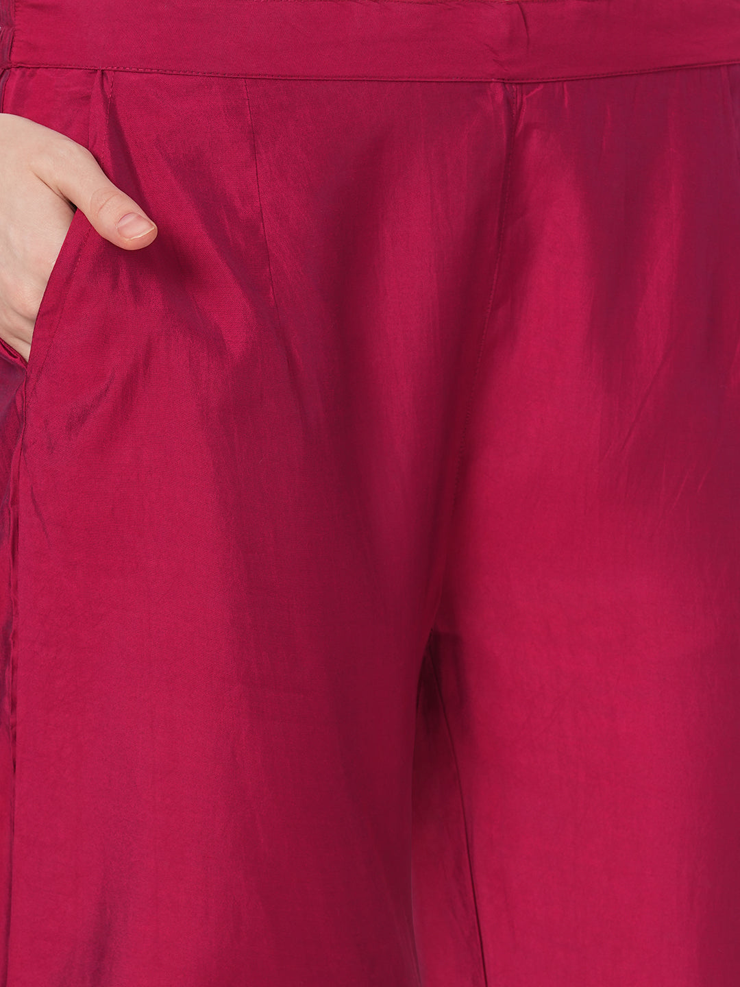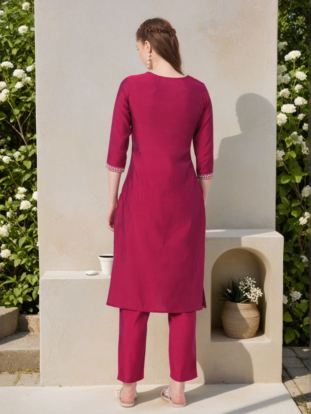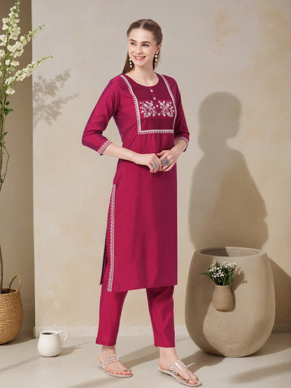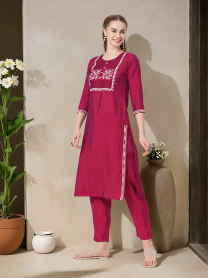 Solid Floral Embroidered Straight Fit Co-ord Set - Magenta