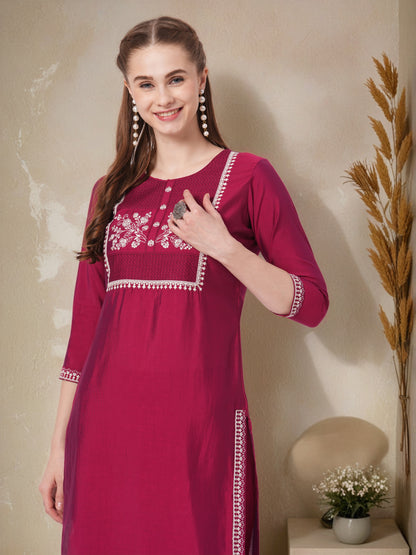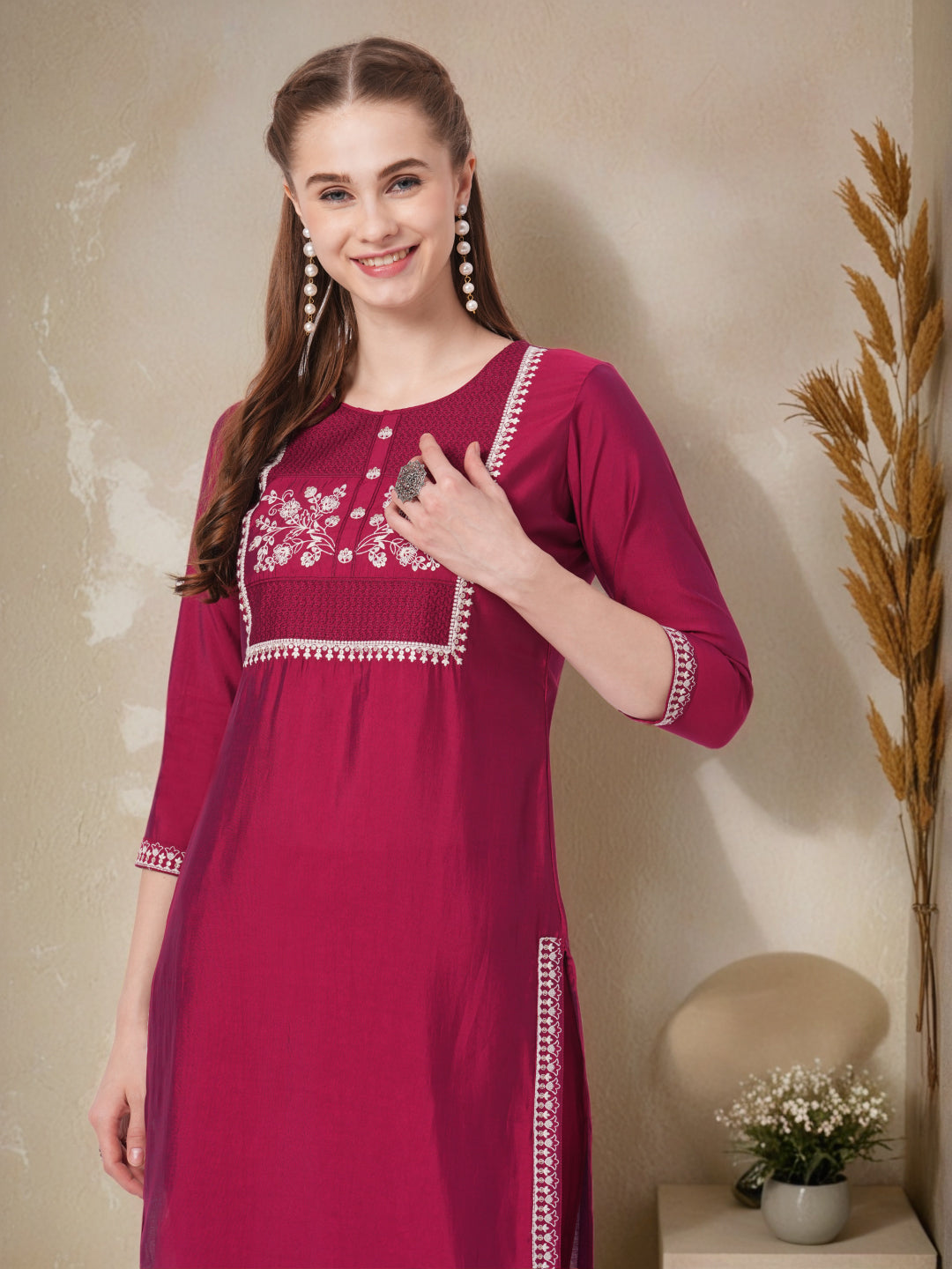 Make a vibrant statement with this Magenta Solid Floral Embroidered Straight Fit Co-ord Set. Featuring a classic round neckline and delicate floral thread embroidery on the yoke, this ensemble blends elegance with everyday charm. Finished with regular sleeves and a coordinating solid pant, it’s the perfect pick for festive gatherings or chic daytime outings.