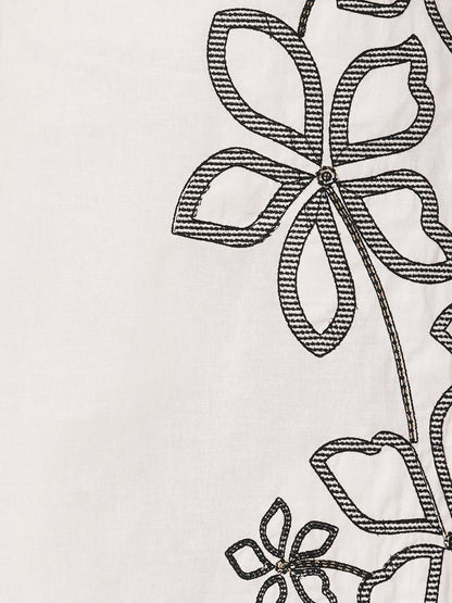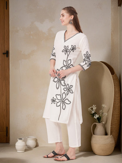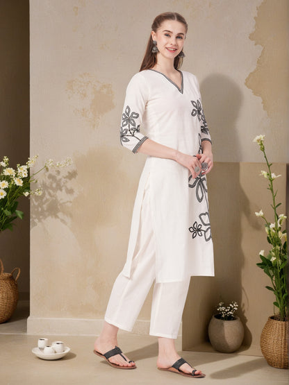 Solid Floral Embroidered Straight Fit Co-ord Set - Off White
