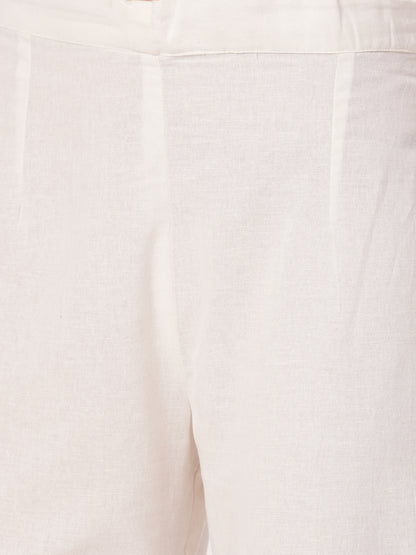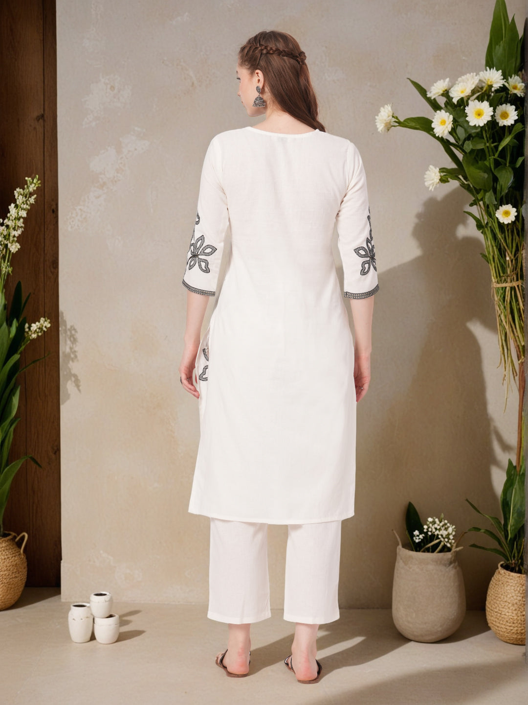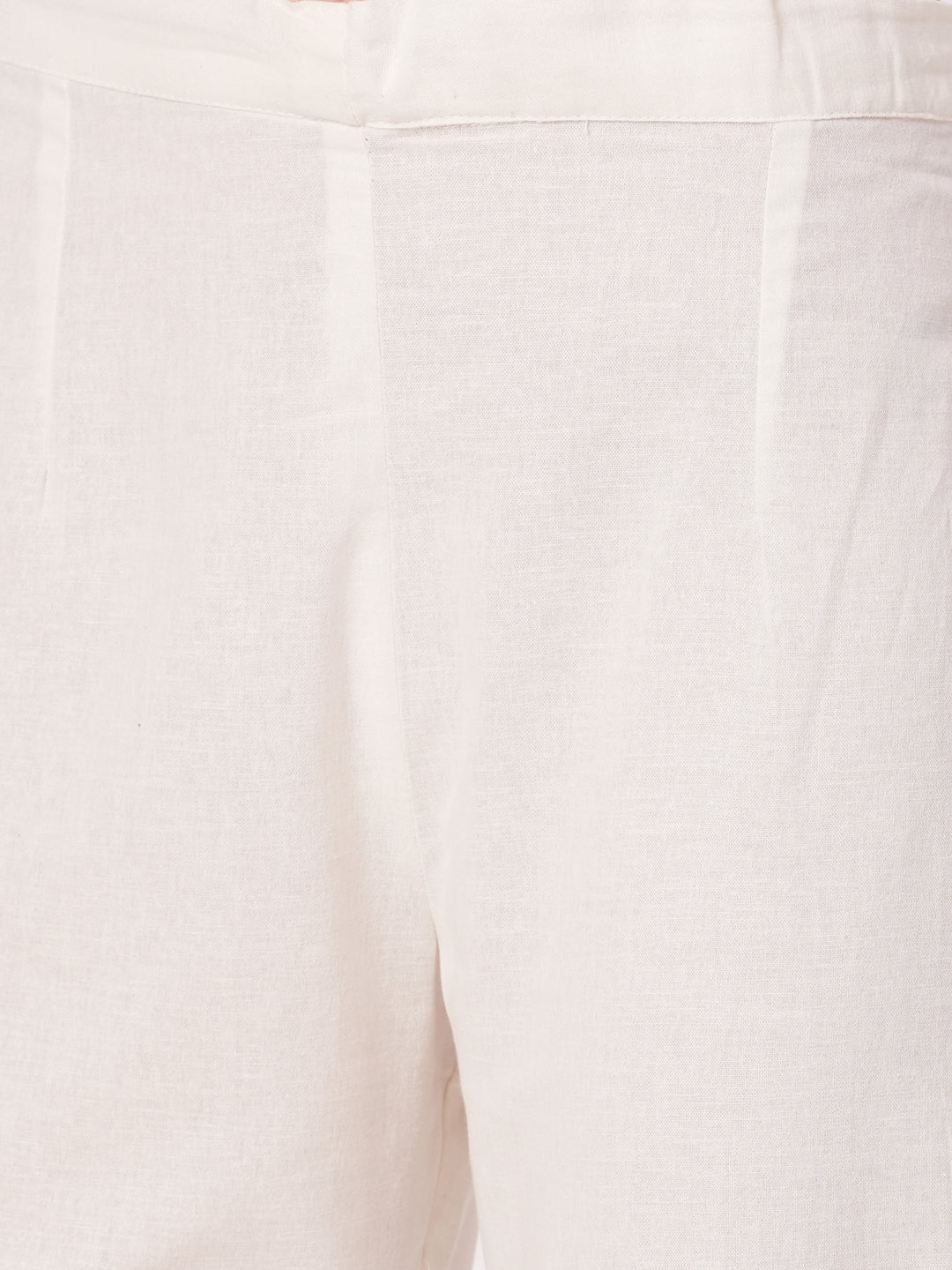 Step into timeless elegance with this Solid Floral Embroidered Straight Fit Co-ord Set in classic off-white. Crafted from breathable cotton flax fabric, it offers a natural texture and airy comfort. The kurta features a flattering V-neckline and is adorned with delicate floral threadwork detailing for a subtle yet sophisticated look. Paired with a matching palazzo, the ensemble delivers effortless grace and everyday wearability. Its minimalist charm makes it ideal for casual outings or semi-formal occasions. A versatile choice that blends simplicity with artisanal finesse.