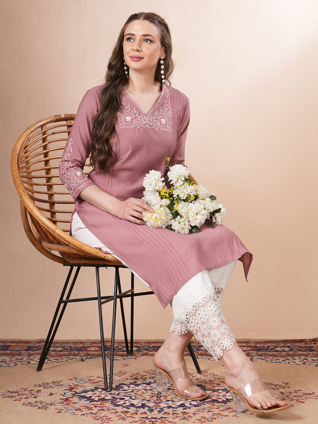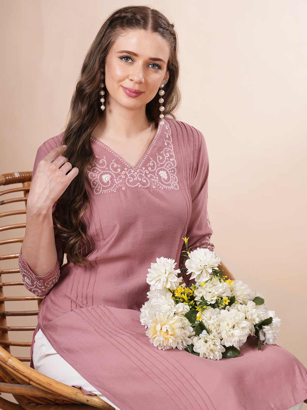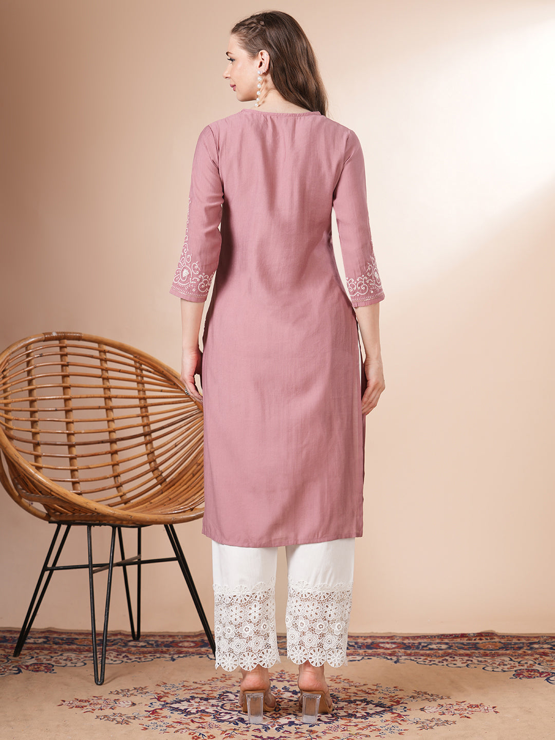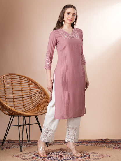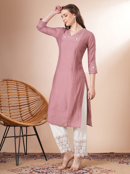Solid Floral Embroidered Straight Fit Kurta - Pink
