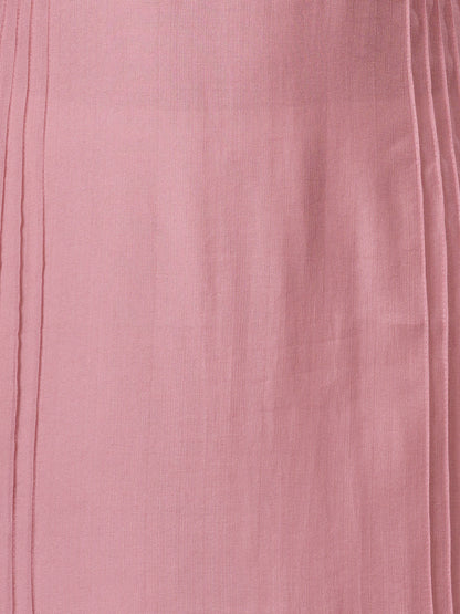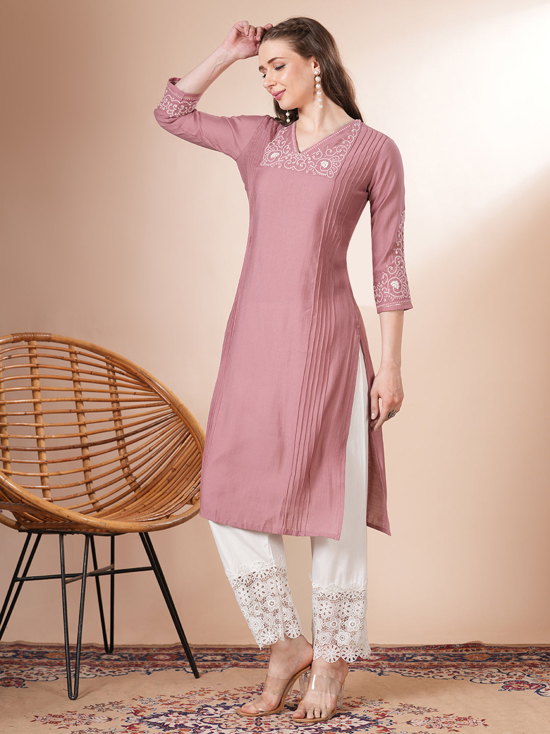 This Solid Floral Embroidered Straight Fit Kurta in a rich pink silk blend exudes timeless elegance. Its V-neckline is adorned with delicate threadwork detailing, complemented by subtle pintuck accents along the front, adding texture and depth. The straight silhouette offers a flattering fit, making it a versatile piece for both festive occasions and refined everyday wear. Crafted from a luxurious silk blend, this kurta promises comfort without compromising on style. Pair it effortlessly with matching trousers or leggings to complete your ensemble.