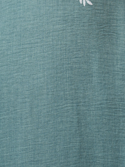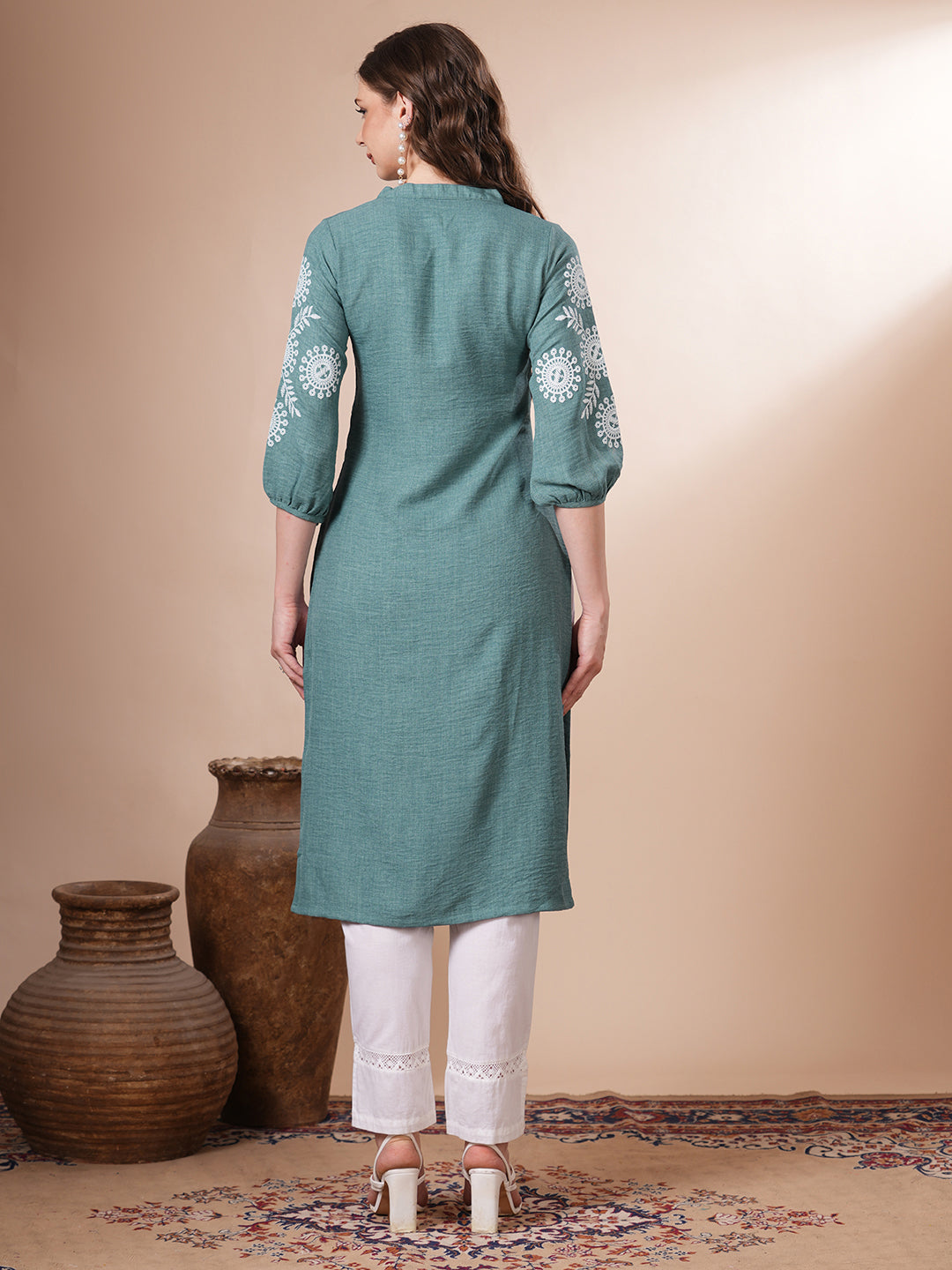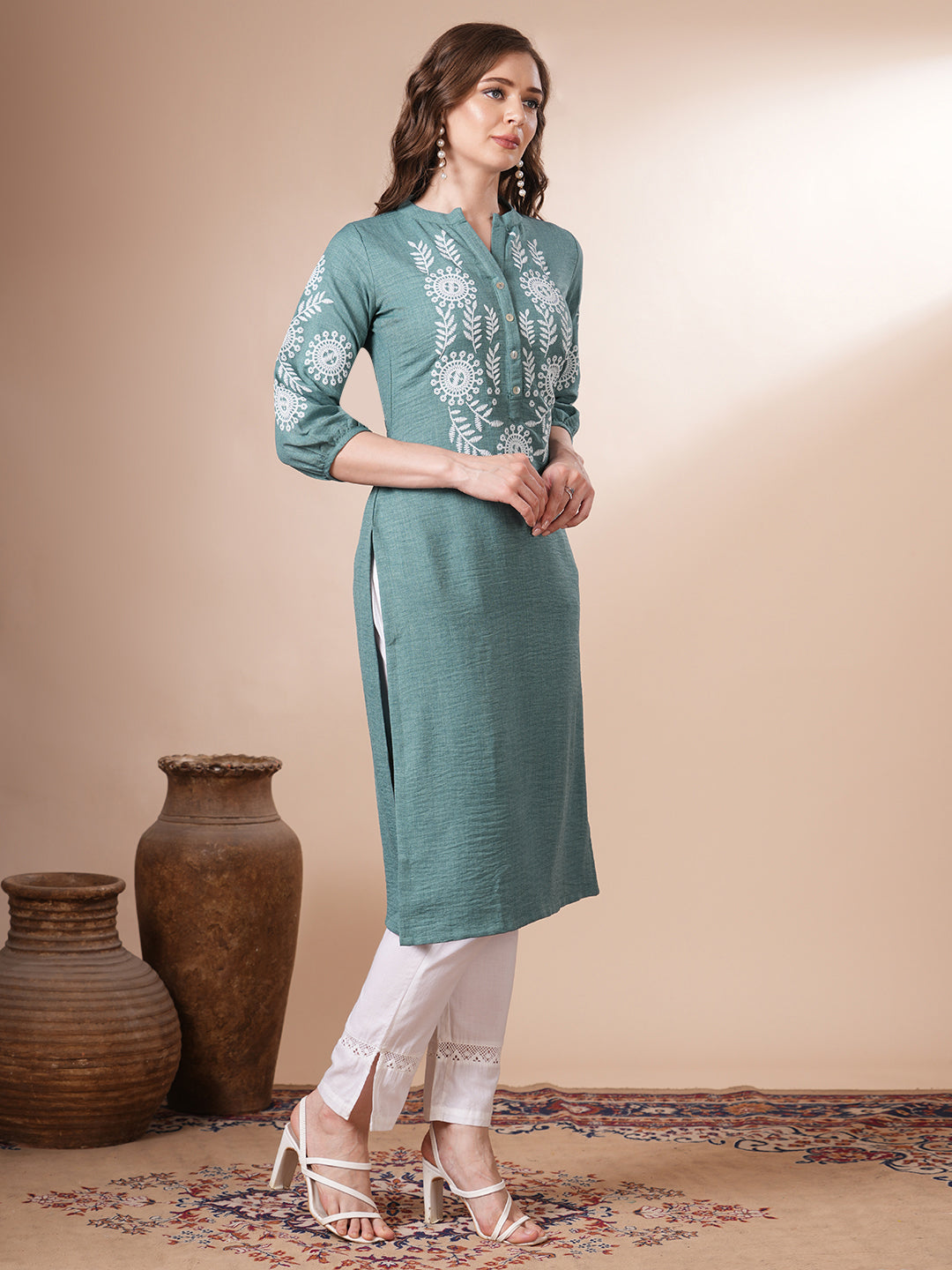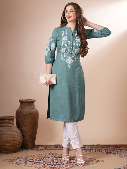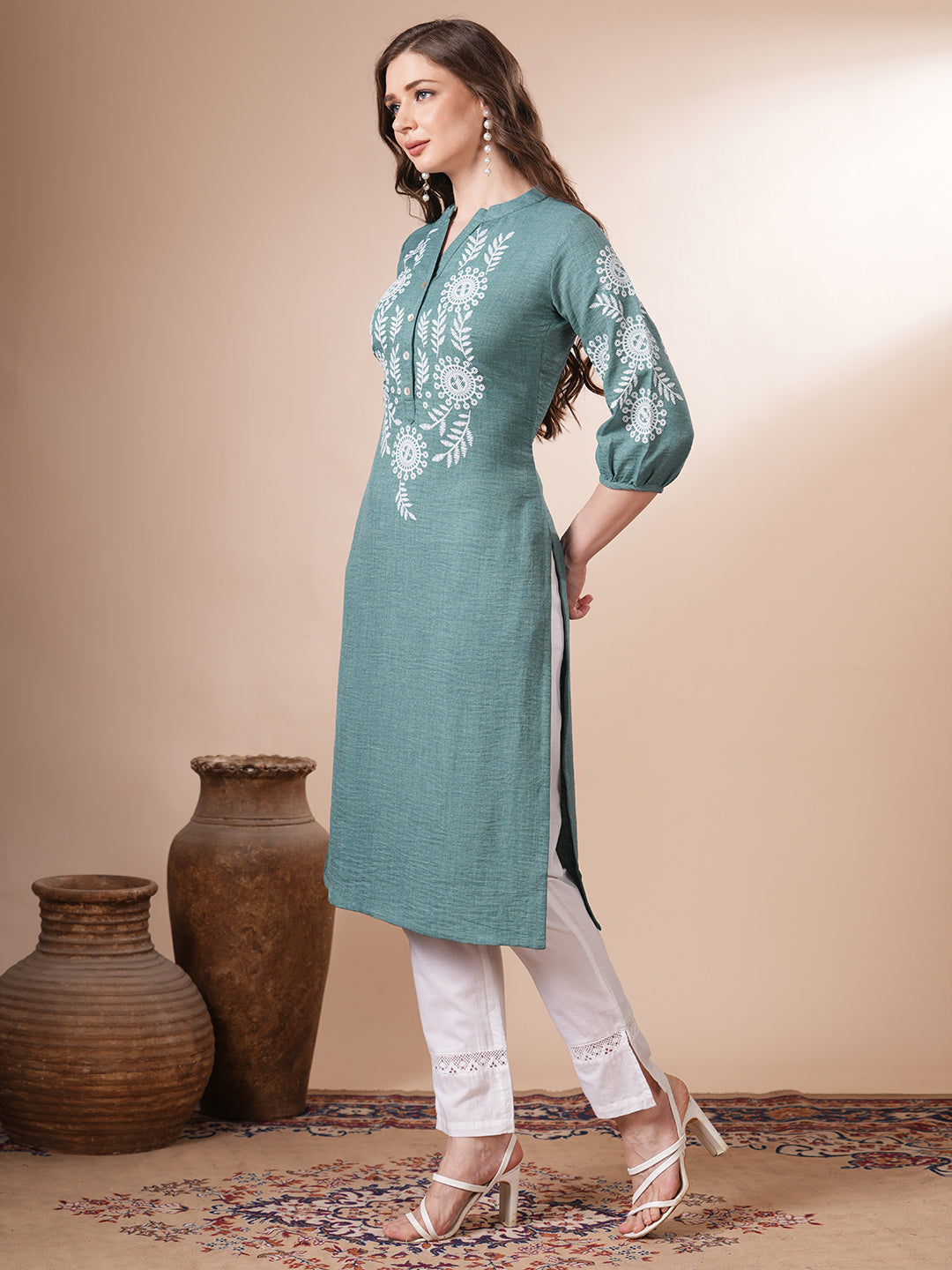 Solid Floral Embroidered Straight Fit Kurta - Sage Green