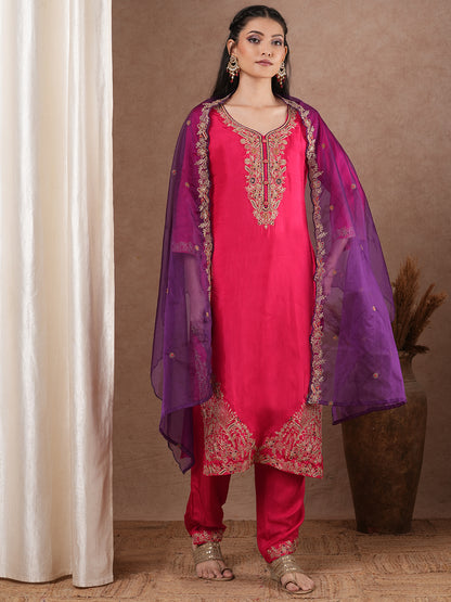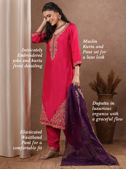 Solid Floral Embroidered Straight Fit Kurta with Pant and Dupatta - Pink
