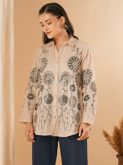 Solid Floral Embroidered Straight Fit Shirt - Beige