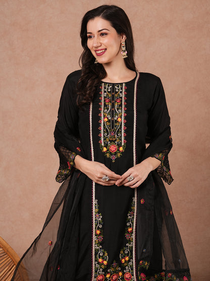 Solid Floral Embroidered Straight Fit Kurta with Pant and Dupatta - Black
