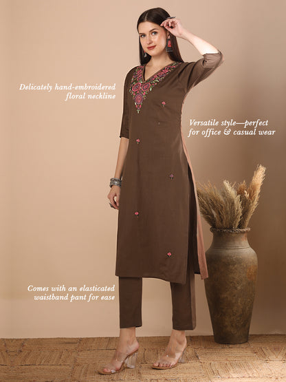 Solid Floral Hand Embroidered Straight Fit Co-ord Set - Brown