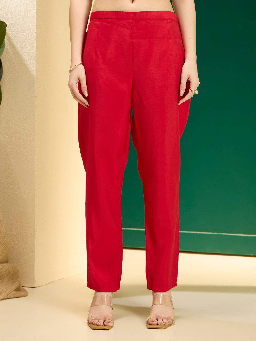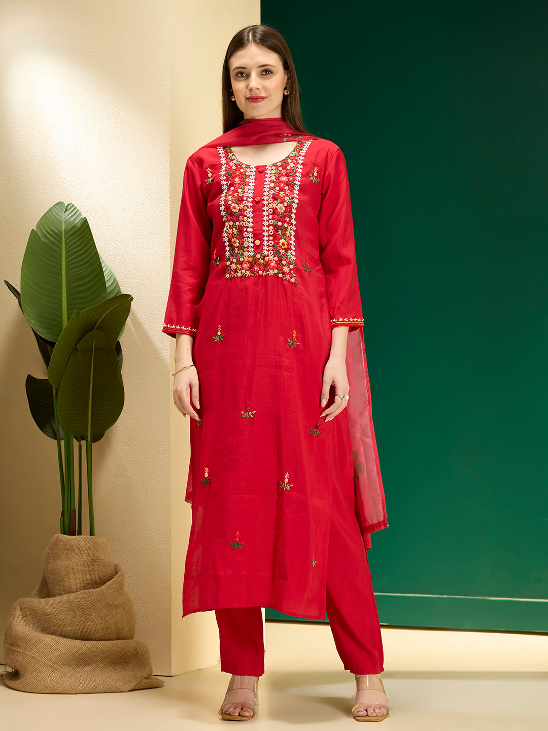 Solid Floral Hand Embroidered Straight Fit Kurta with Pant & Dupatta - Red