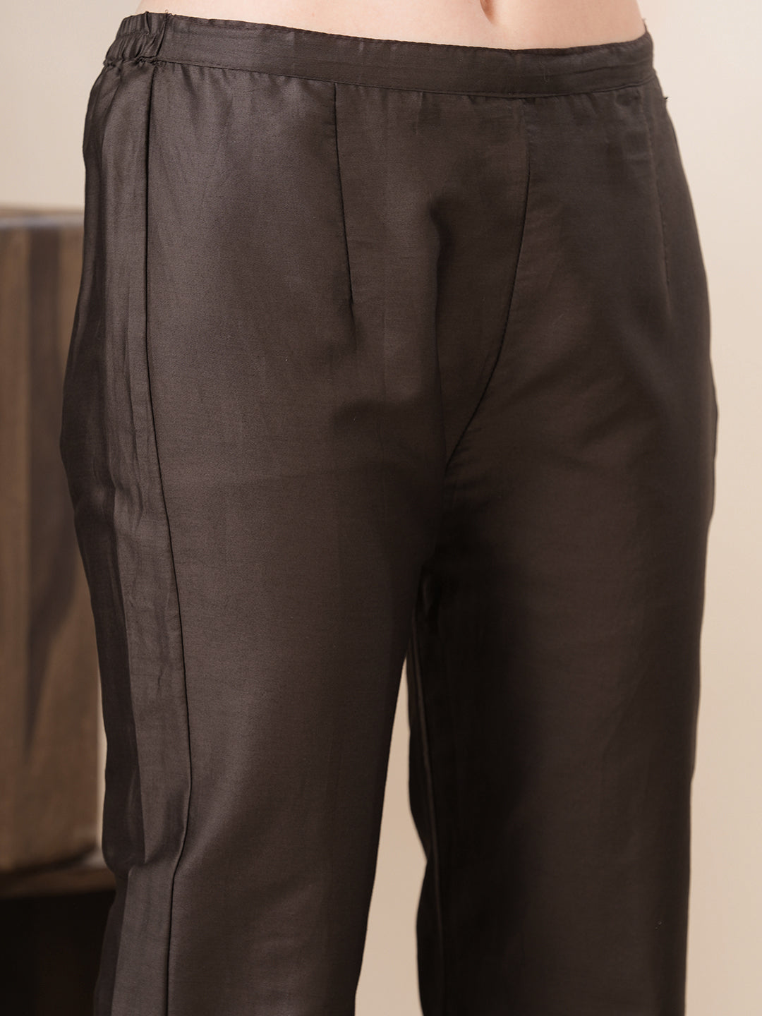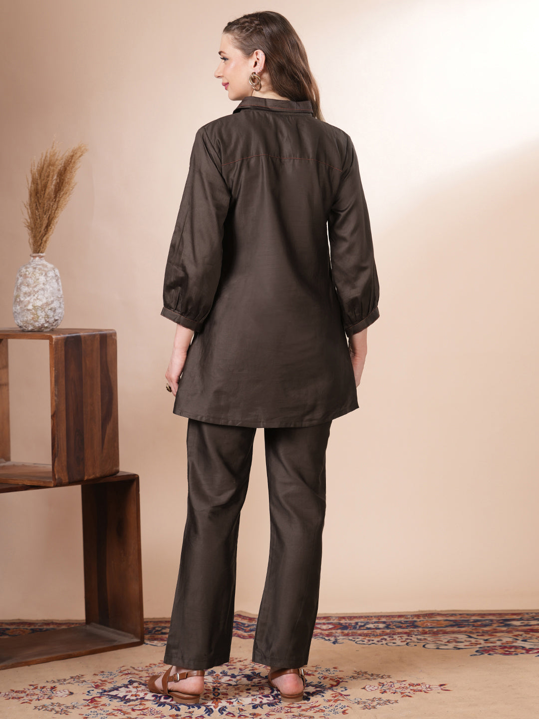 A harmony of tradition and trend, this straight-fit co-ord set in rich brown muslin silk features a crisp shirt collar and intricate floral patchwork at the front. Lightweight yet luxurious, it offers a graceful drape and subtle sheen—perfect for refined daytime affairs or elevated casual wear. A timeless ensemble with a modern twist.