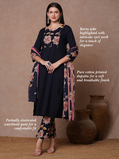This straight fit kurta with ethnic floral printed yoke and highlighted with zari work, paired with printed pant and pure cotton printed dupatta is a perfect fit for everyday wear.