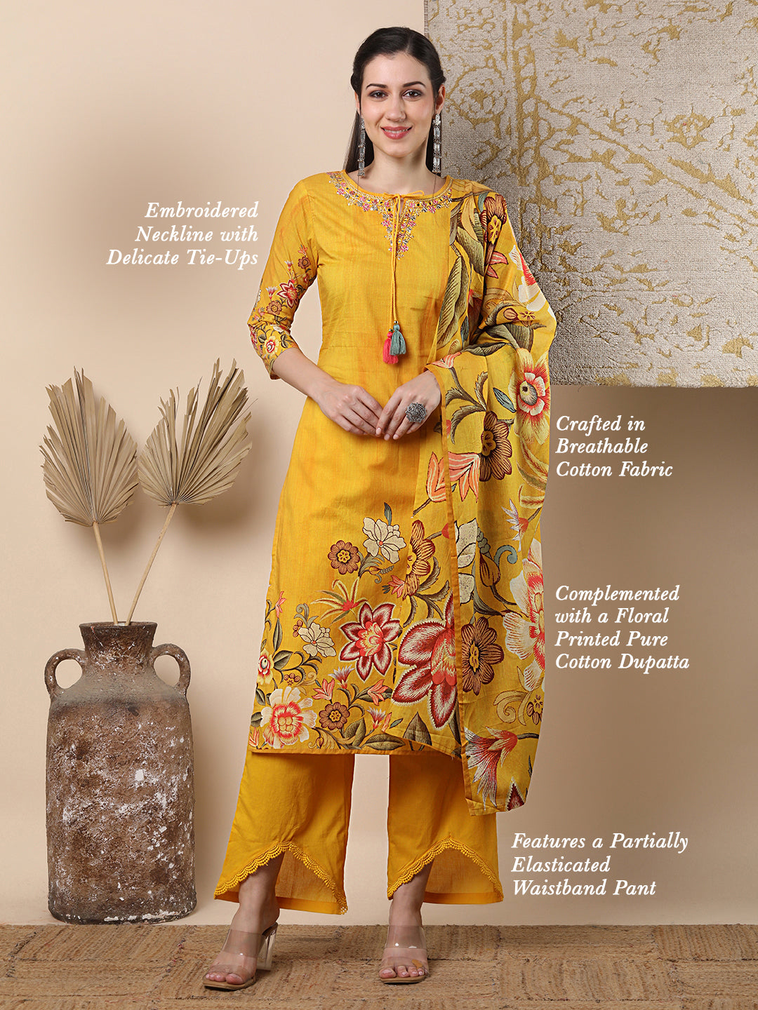 Solid Floral Printed & Embroidered Straight Fit Kurta with Pant & Dupatta - Yellow