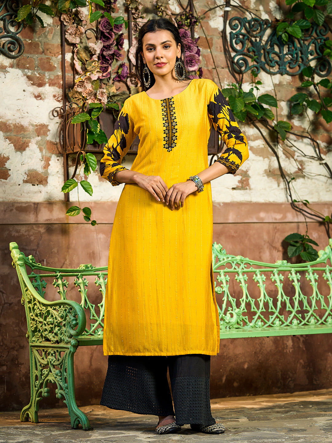 Solid Floral Printed & Embroidered Straight Fit Kurta - Yellow