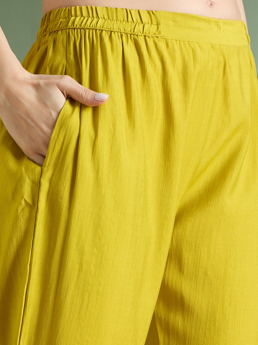 Solid Floral Printed Straight Fit Kurta with Pant and Printed Dupatta - Mustard