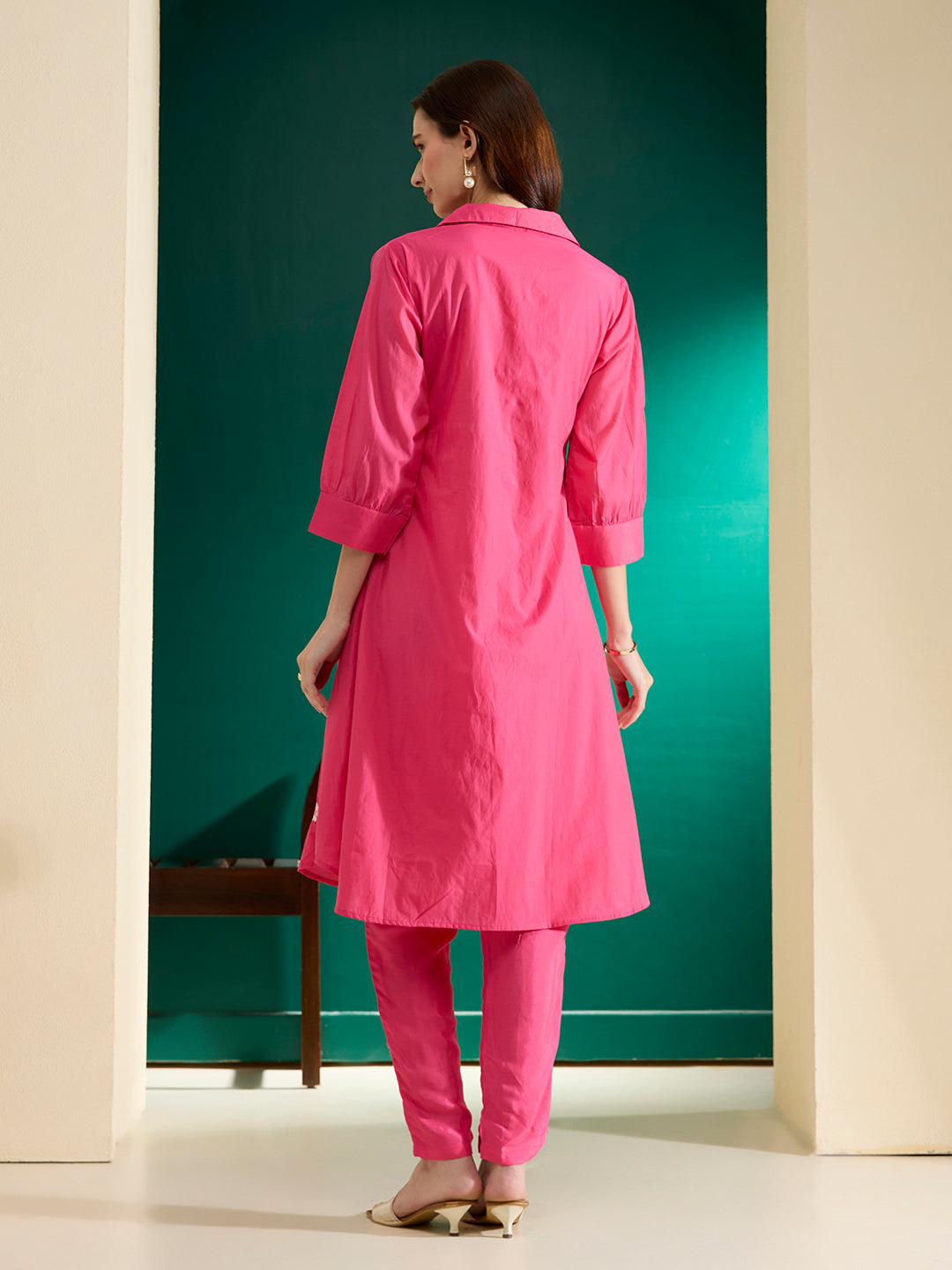 Bloom with grace in this Solid Floral Resham Embroidered A-Line Co-ord Set in soft pink, tailored from breathable cotton fabric for all-day comfort and charm. The shirt-collar kurta exudes a touch of sophistication, while the delicate floral resham embroidery adds a feminine flourish. Finished with stylish puff sleeves and a flattering A-line silhouette, this co-ord set is the perfect blend of elegance and ease — ideal for brunches, festive gatherings, or casual celebrations.