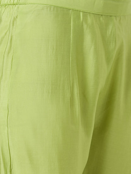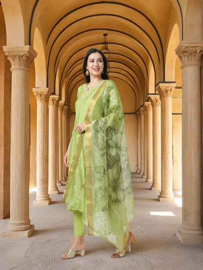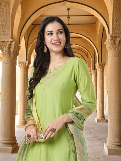 Solid Floral Resham & Hand Embroidered Straight Kurta with Pant & Printed Dupatta - Green