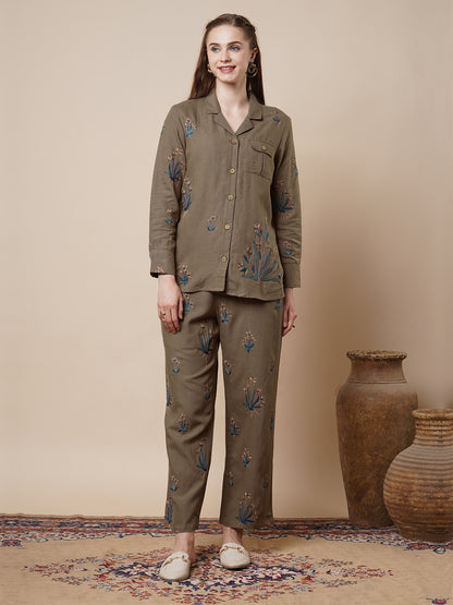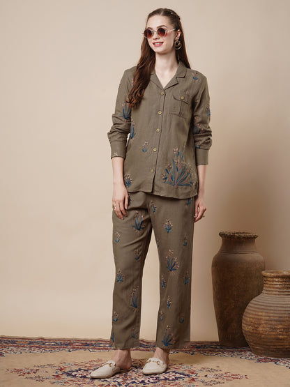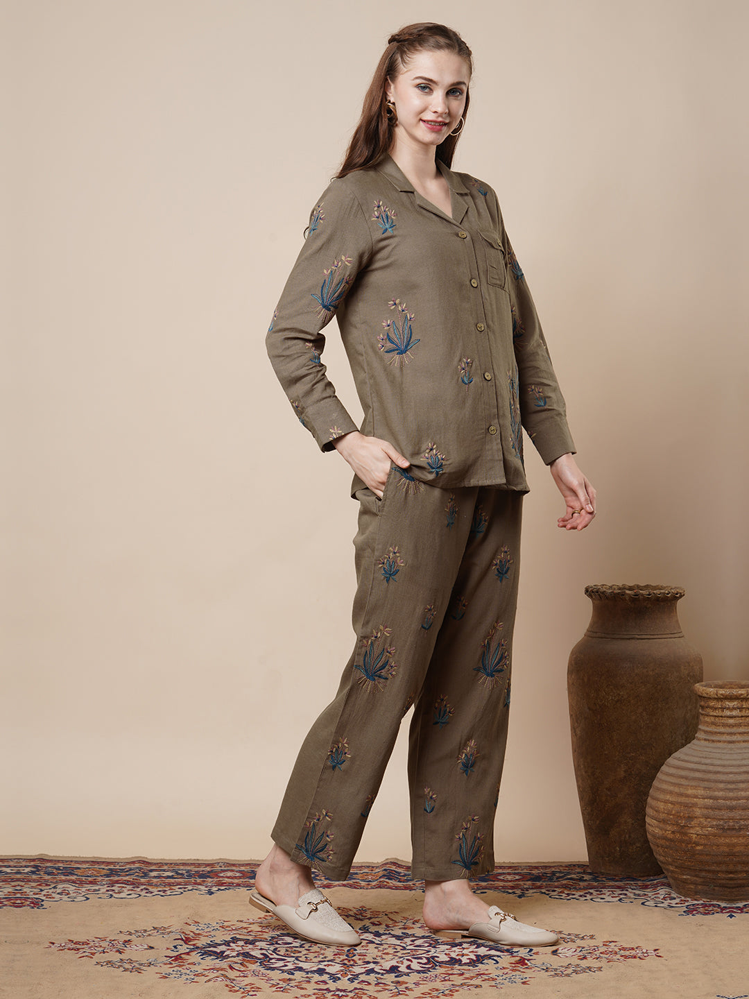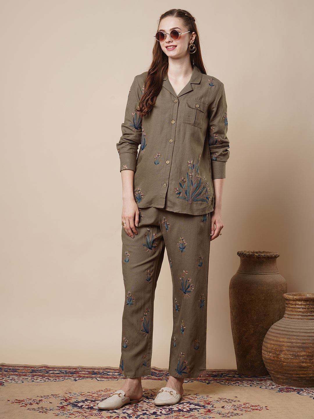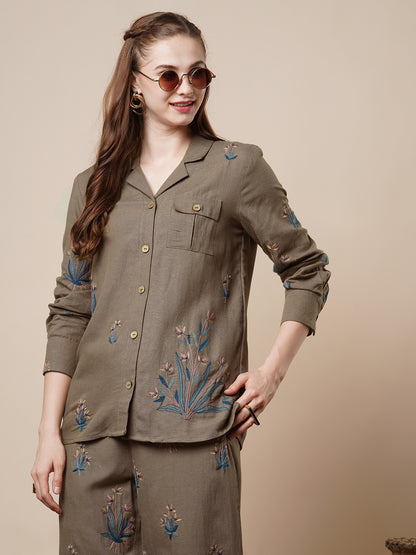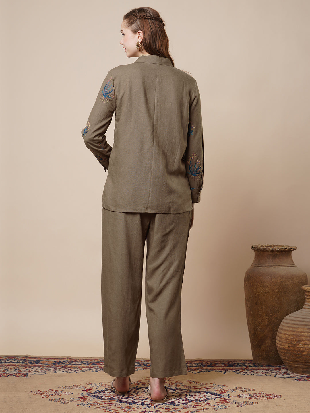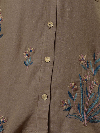 Make a bold statement with this Solid Floral Thread Embroidered Co-ord Set in timeless Brown. Crafted from soft, breathable cotton, the set features quirky floral thread embroidery that adds playful charm to both the shirt and palazzo. Designed with a sharp lapel collar and stylish cuffed sleeves, it blends tailored sophistication with easygoing flair. The straight-fit silhouette offers a flattering drape, perfect for day-to-evening transitions. A chic choice for modern women who love a touch of whimsy in their wardrobe.