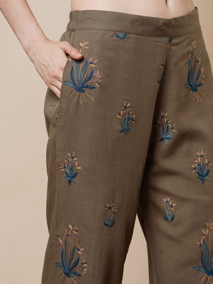 Solid Floral Thread Embroidered Cotton Straight Fit Co-ord Set - Brown