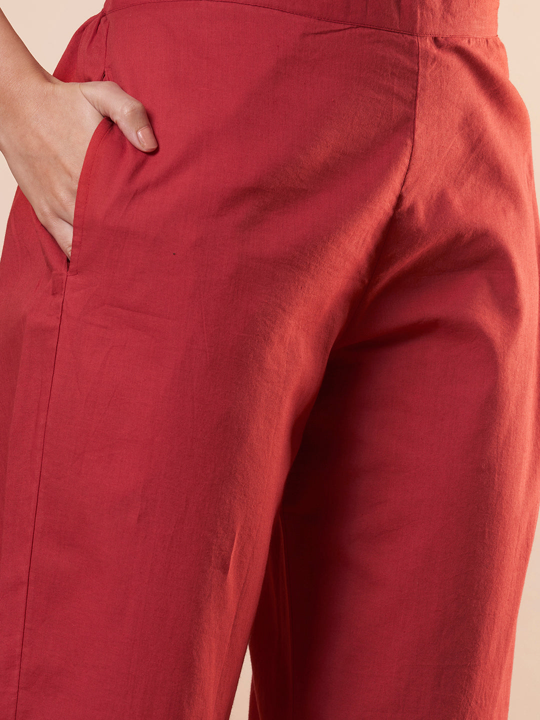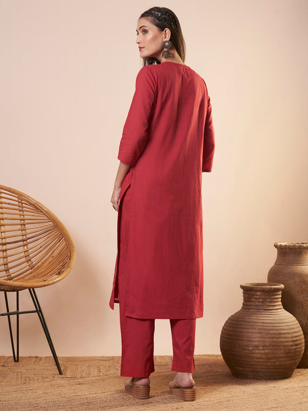 Brighten your look with this Solid Floral Threadwork Embroidered A-Line High-Low Co-ord Set in a cheerful Red hue. Crafted from soft, breathable cotton, the set features intricate floral threadwork that adds a touch of elegance to its contemporary high-low silhouette. The classic round neckline and coordinated bottoms create a chic, balanced ensemble—perfect for brunches, festive gatherings, or effortless daytime glamour.