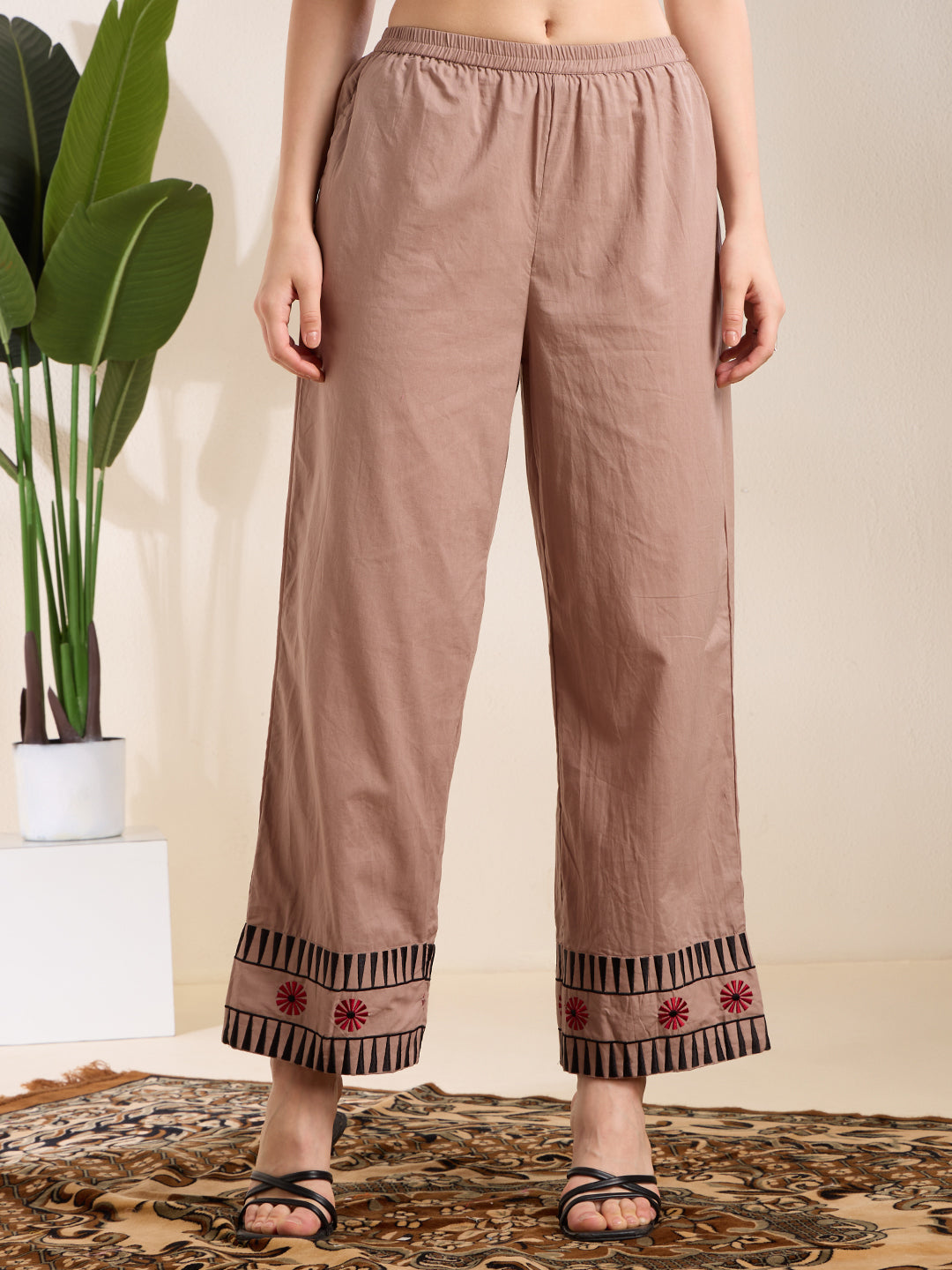 Step into subtle sophistication with this Light Grey Solid Geometric Embroidered Straight-Fit Kurta Set, crafted from soft, breathable cotton fabric. The chic round neckline is complemented by elegant geometric threadwork, adding refined detail to its minimalist design. Paired with a matching palazzo for effortless comfort and style, this set is perfect for everyday elegance or polished casual outings.