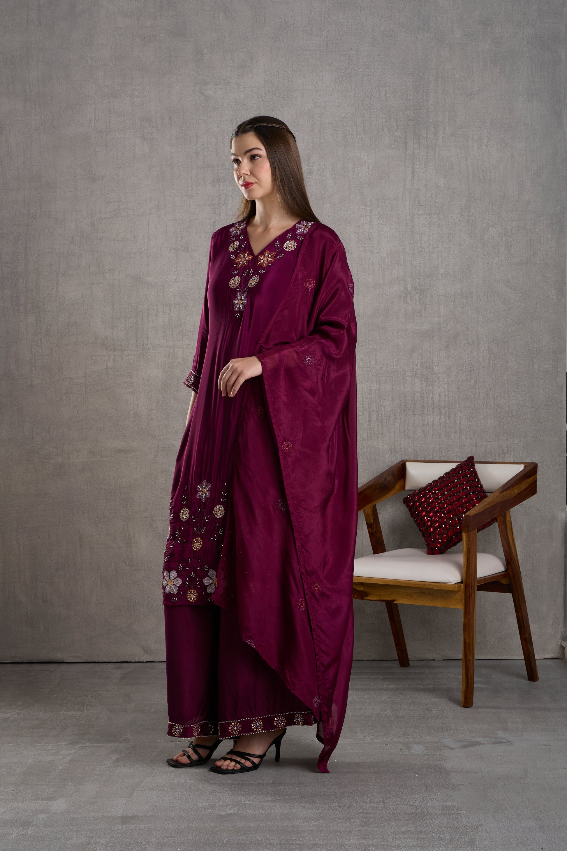 Solid Hand Embroidered Straight Kurta with Palazzo and Dupatta - Burgundy