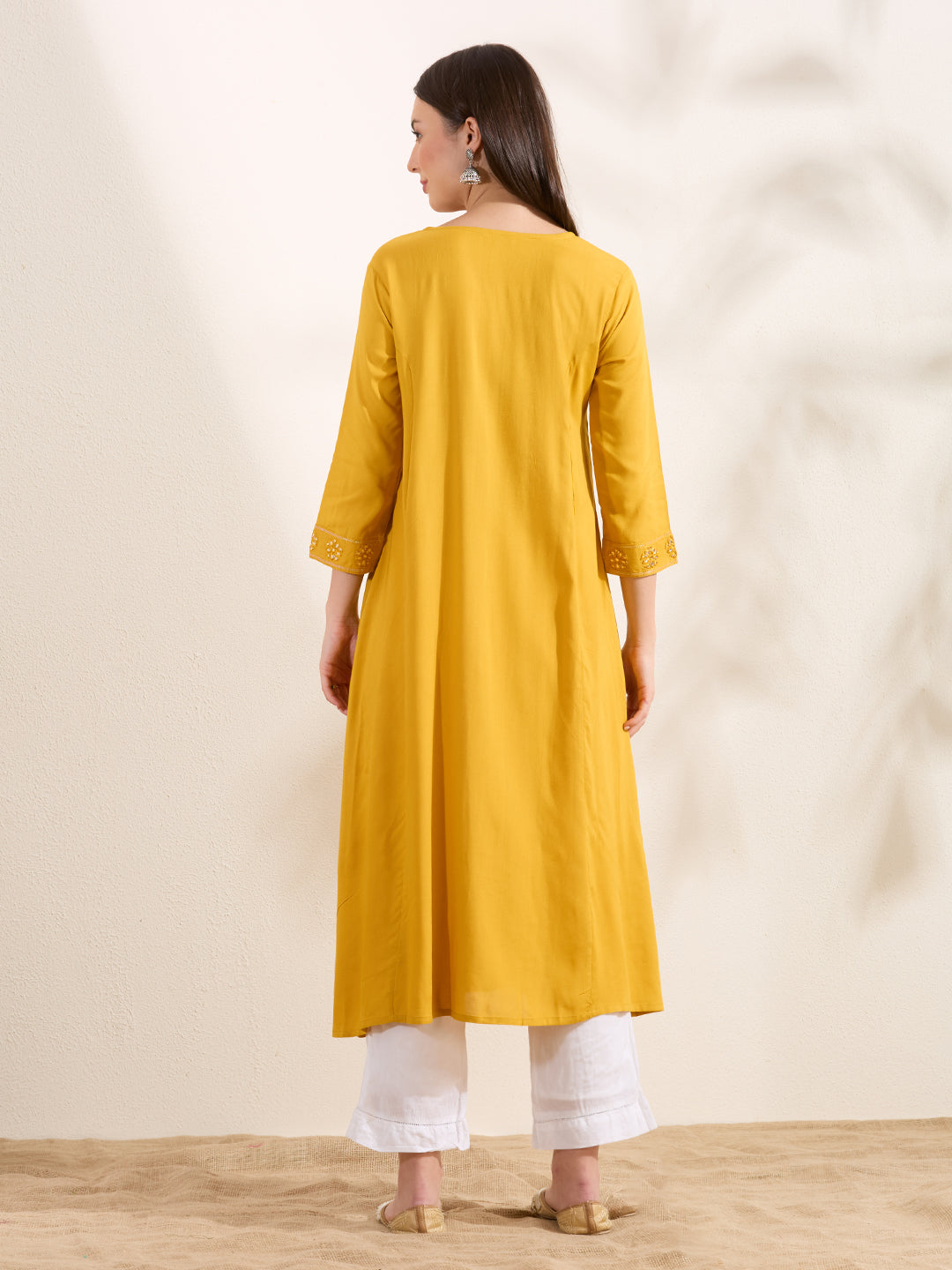 Solid Mirror Embroidered A-Line Flared Kurta - Yellow